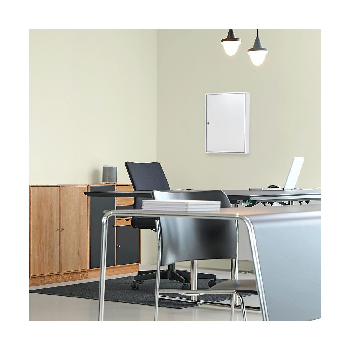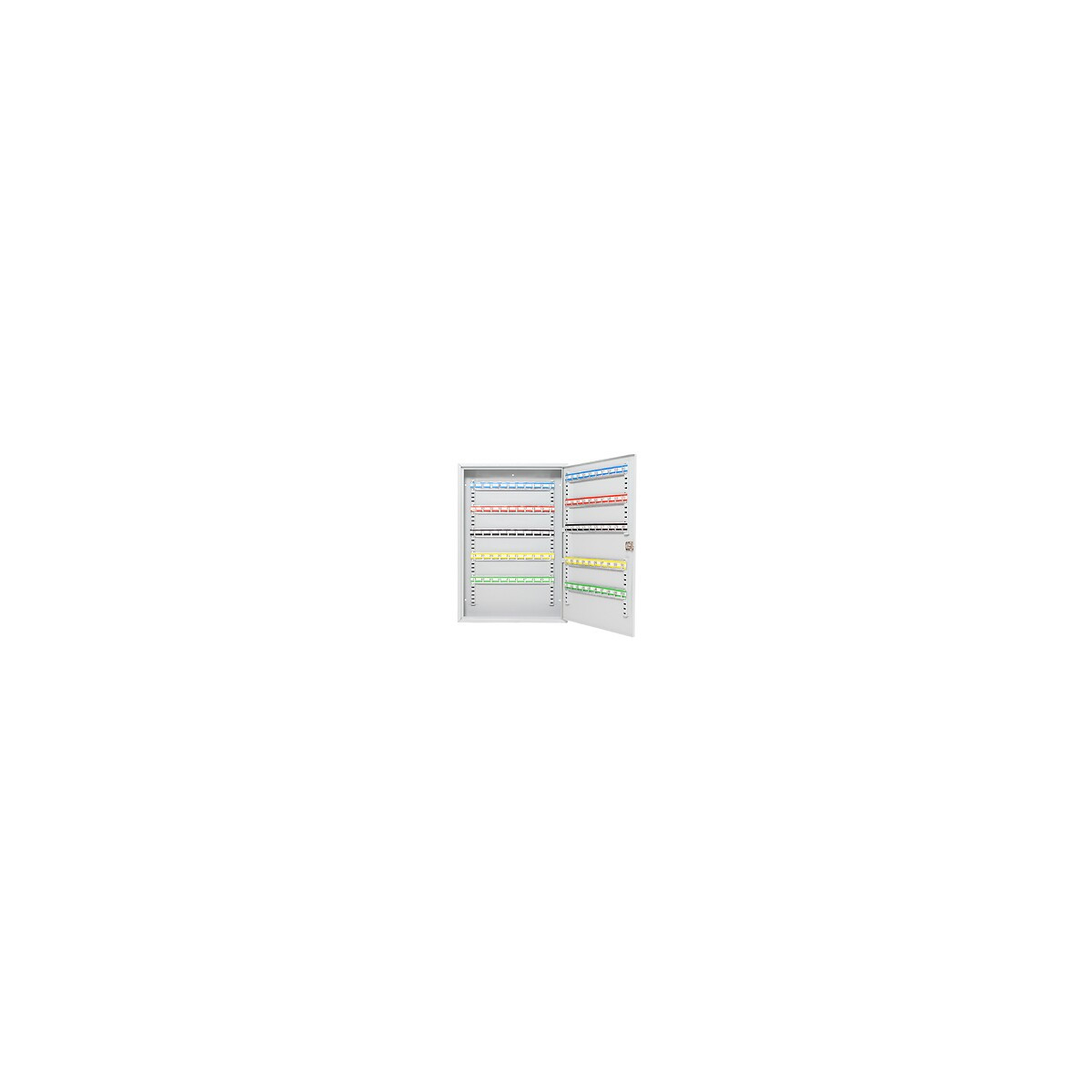 Serrure à cylindre, 2 clés Corps et porte en tôle de haute qualité, Poudre de plastique enduite de gris clair 100 porte-clés inclus gratuitement. Les bandes de crochets sont numérotées et réglables dans le système de crochets destiné au montage mural 4 trous dans la paroi arrière Ø 5,5 mm Le matériel de montage est inclus Dimensions extérieures mm (H x L x P) :550 x 380 x 80 Poids : 5,8 Kg Nombre de crochets:100 clésSpécifications techniques