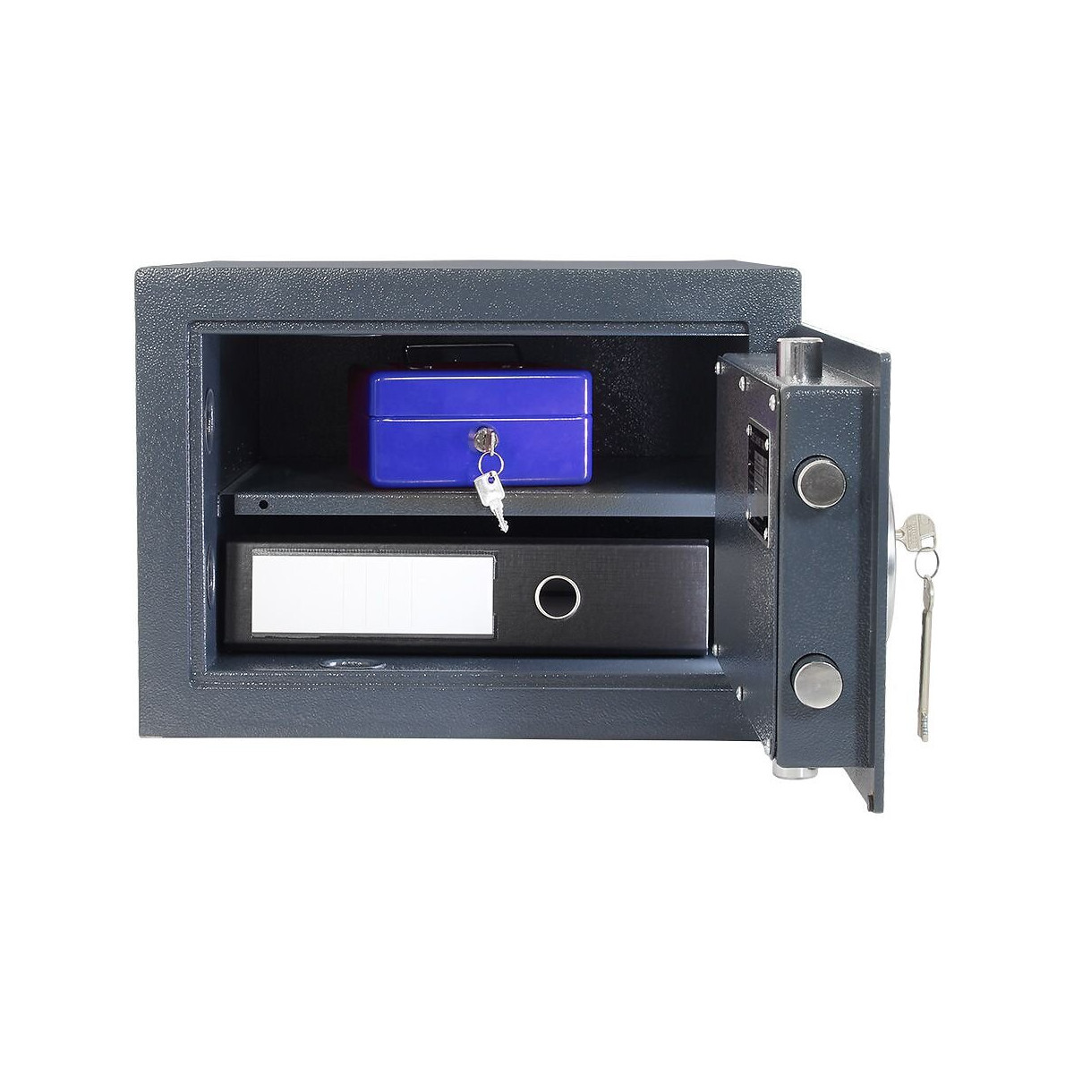 EN-0 selon CSN EN-1 1143-1 protection contre le feu limitée en raison du pli du feu Serrure haute sécurité à double panneton EN 1300 classe A avec blindage de protection en acier au manganèse serrure anti-perçage 2 clés incl. Profondeur extérieure +15 mm par ferrure rapportée corps à parois multiples Feuille de porte 5 mm Serrure à pêne robuste à 3 côtés Angle d'ouverture de la porte 90 degrés, charnières cachées 1 étagère (amovible) 2 trous au sol, Ø 14 mm Matériel de montage inclus Les coffres-forts de moins de 1000 kg doivent être ancrés dans un élément solide ! Dimensions extérieures mm (H x L x P) :300 x 420 x 390 Dimensions intérieures (mm) H x L x P :220 x 340 x 300 Poids : 35 Kg Volume:22.44 litresSpécifications techniques