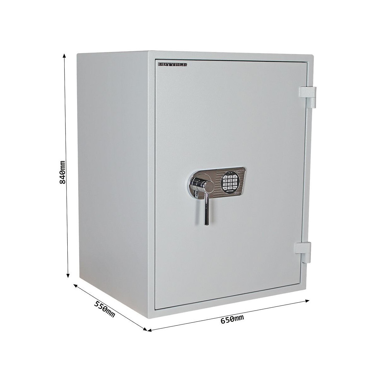 Classe de sécurité anti-effraction "1" selon ECB S 1143-1 Protection incendie : LFS-30P selon EN-15659 BG, ECB-S Serrure électronique sans révision (pas d'ouverture de clé) peut être alimenté en courant de secours Foret de verrouillage protégé Raccord chromé massif avec poignée à levier (+ 60mm pour poignée) Corps en acier de haute qualité, épaisseur 24 mm Feuille de porte 10 mm Epaisseur de porte 62 mm Fermeture à 3 côtés Barre de préhension arrière côté charnières Charnières extérieures, angle d'ouverture de 180 ° possible 2 étagères, 14 dossiers Coffre-fort intérieur (vissé) avec 2 clés, h 190 mm Matériel de montage inclus 1 trou inférieur, percé Les coffres-forts de moins de 1000 kg doivent être ancrés dans le sol en béton. Dimensions extérieures mm (H x L x P): 840 x 650 x 550 mm Dimensions internes: (H x L x P): 782 x 574 x 420 mm Poids: 284 kg Volume:189 litresSpécifications techniques