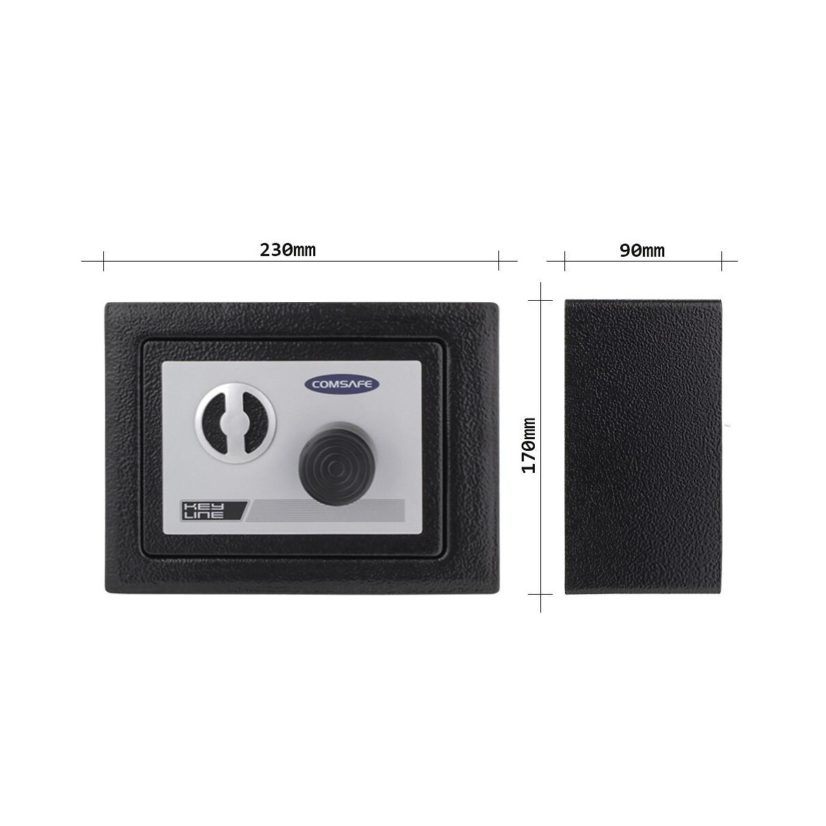 Coffre à clés en acier de haute qualité Corps 2 mm d'épaisseur Feuille de porte 4 mm d'épaisseur Avec pliage coupe-feu et charnières internes stables Serrure à pêne robuste à 2 volets, conçue pour un montage mural y compris le matériel d'ancrage et les trous 5 crochets pour clés Serrure à combinaison mécanique protégé par un capuchon en caoutchouc serrure mécanique Les ferrures augmentent la profondeur extérieure à 30 mm. Dimensions extérieures : 170 x 230 x 90 mm Dimensions intérieures : 165 x 225 x 50 mm Poids : 3 Kg Volume:1,86 litresSpécifications techniques