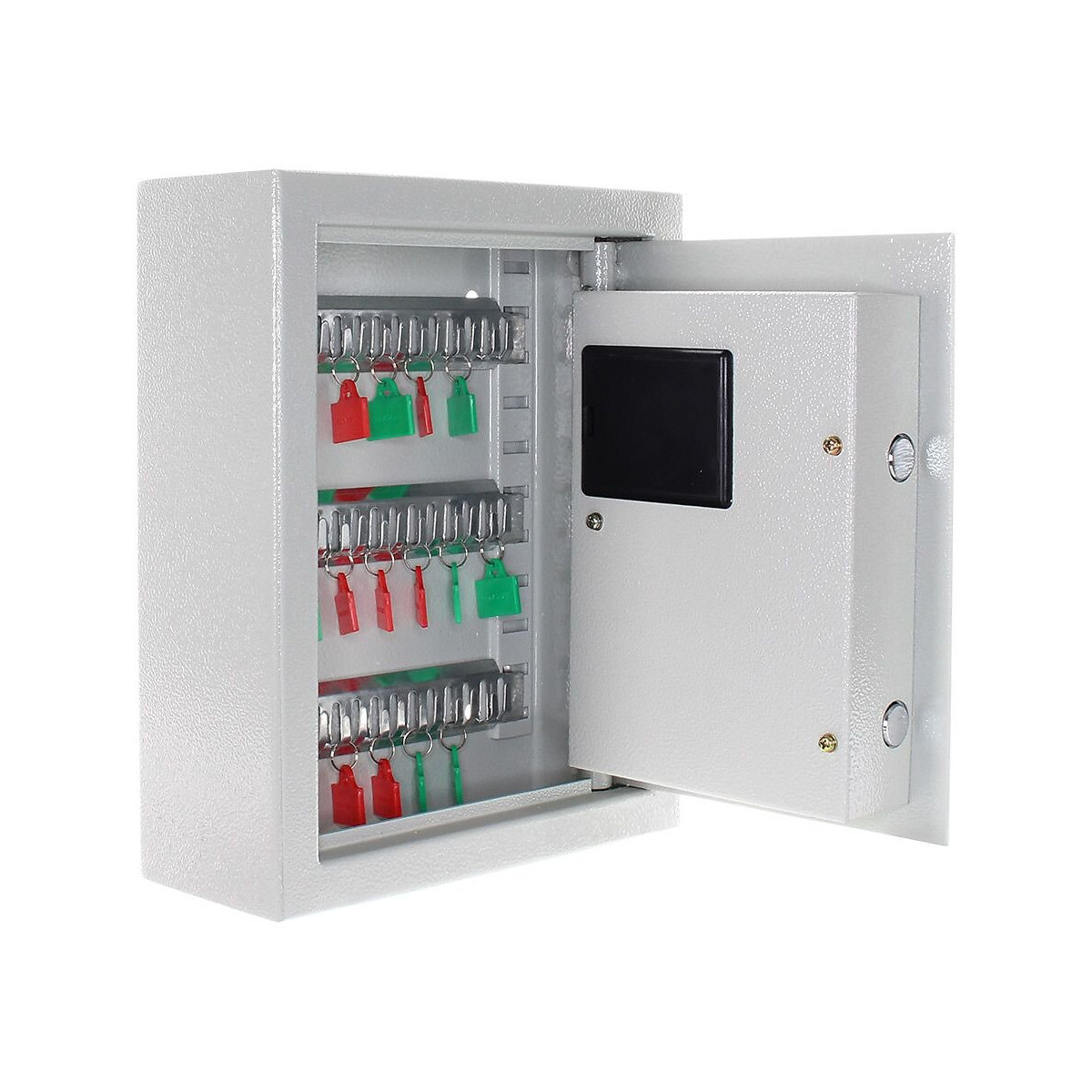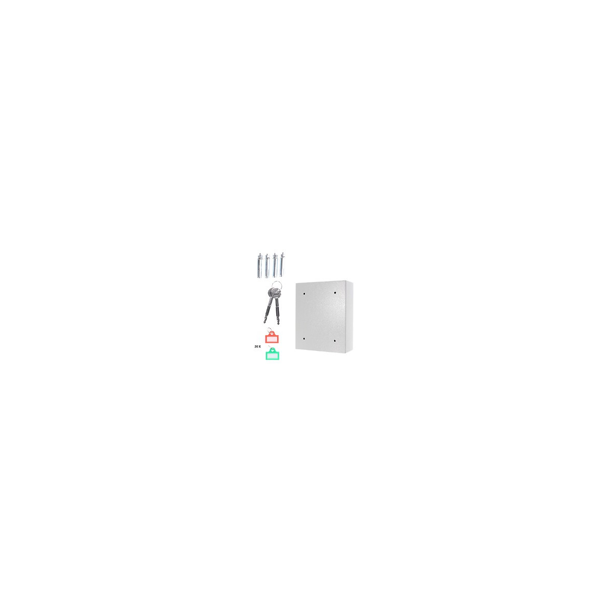 Serrure électronique avec 100 millions d'options de commutation, avec code maître et utilisateur (jusqu'à 8 chiffres) facile à utiliser grâce au clavier large et facile à lire Fonctionnement sur piles avec des piles standard de 1,5 V. ouverture mécanique possible avec une clé Ouverture de porte:240x140mm (HxL) Armoire à clés en acier de haute qualité Corps 2 mm d'épaisseur Feuille de porte 4 mm d'épaisseur Matériel de montage inclus 4 trous dans le mur du fond Dimensions extérieures: 300 x 245 x 110 mm Dimensions intérieures : 295 x 240 x 30 mm Poids : 6 Kg Nombre de crochets:20 clésSpécifications techniques