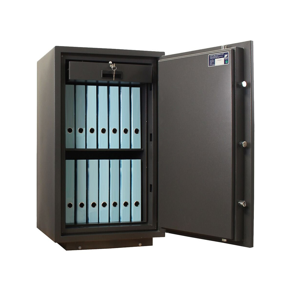 LFS 60P selon EN 15659 (ECB-S) 60min protection incendie pour papier selon ECB-S Serrure électronique, à piles avec 4 piles AA 1,5 V (hors pile) ouverture d'urgence électronique Poignée à levier 1 x code maître et 4 x code utilisateur corps à double paroi rempli de matériel spécial de protection contre l'incendie Charnières externes 6 boulons 1 tiroir en acier verrouillable en haut (H 85 mm) 2 étagères - réglables 1 trou au sol avec Ø 10 mm Matériel de fixation inclus dans la livraison Dimensions extérieures mm (H x L x P) :970 x 565 x 450 Dimensions intérieures mm (H x L x P ):786 x 426 x 301 Poids : 138 Kg Volume:101 litresSpécifications techniques