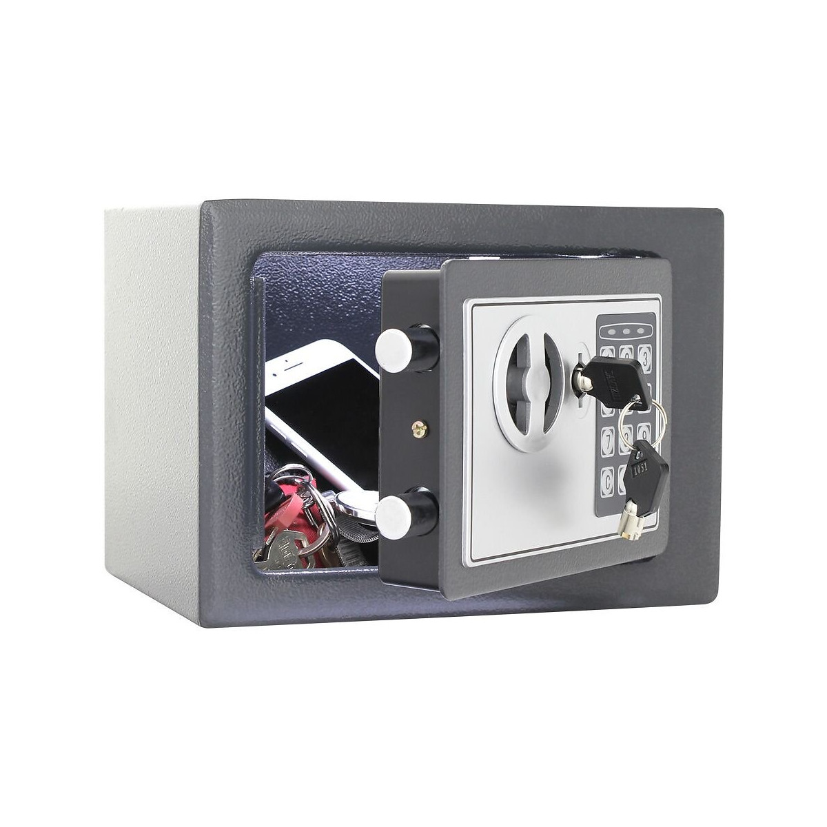 Serrure électronique avec 100 millions d'options de commutation (uniquement code utilisateur à 8 chiffres), sans affichage Fonctionnement sur piles avec 4 piles AA de 1,5 volts (non incluses) ouverture mécanique d'urgence possible, avec 2 clés clavier facile à lire 2 trous dans la paroi arrière avec Ø 8 mm 2 trous dans le fond avec Ø 8 mm Matériel de fixation inclus dans la livraison Coffre-fort pour meuble à simple paroi Acier de haute qualité Feuille de porte 3 mm Corps 1 mm Feu pli Charnières internes stables Angle d'ouverture de porte de 90 ° verrouillage à boulon fort, double Dimensions extérieures mm (H x L x P) :170 x 230 x 170 Dimensions intérieures mm (H x L x P ):165 x 225 x 105 Poids :2.9 Kg Volume:4 litresSpécifications techniques