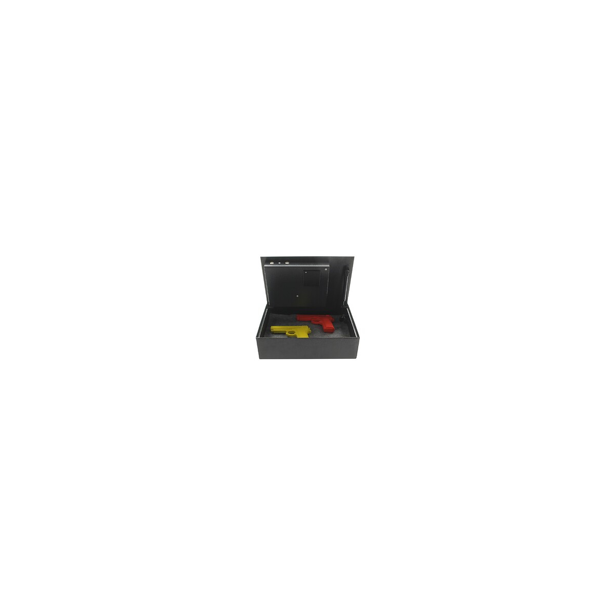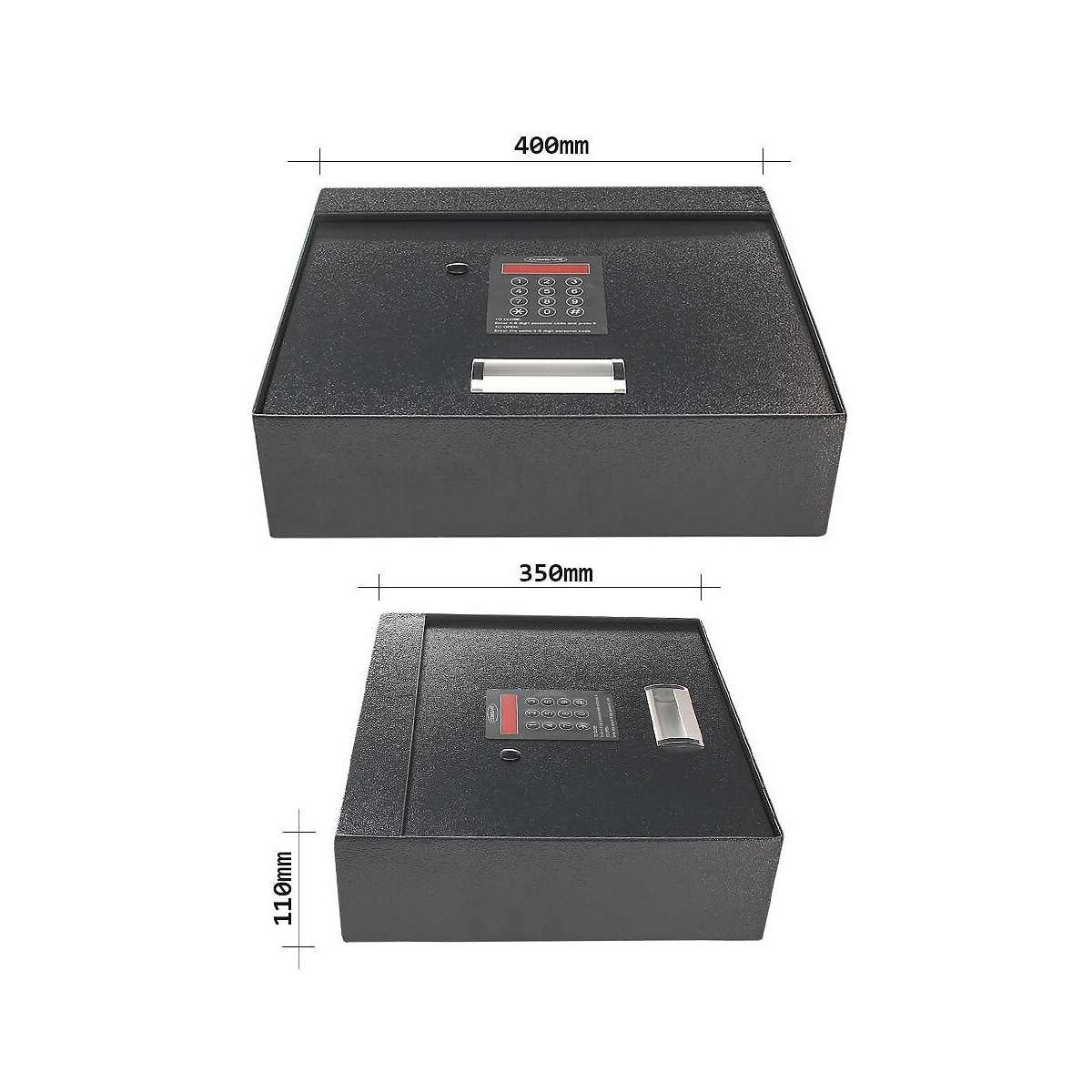 Serrure électronique avec quatre piles de 1,5 volts (piles non incluses) ouverture d'urgence électronique (code maître) ouverture mécanique d'urgence (par clé, 2 voies) coffre-fort à simple paroi La porte s'ouvre Feuille de porte 4 mm Corps 1,5 mm avec pli de feu Les verrous s'ouvrent et se ferment automatiquement Affichage des chiffres rougeoyant Matériel d'ancrage incl. 4 trous en bas Dimensions extérieures mm (H x L x P) :110 x 400 x 350 Dimensions intérieures mm (H x L x P) :55 x 395 x 345 Poids : 10 Kg Volume:7.5 litresSpécifications techniques