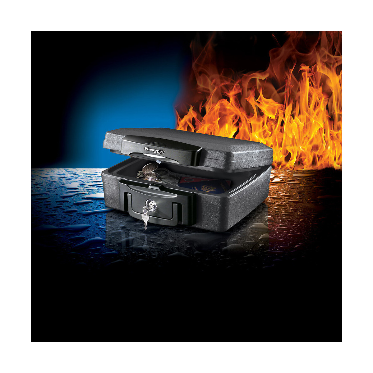 Construction résistant au feu et à l’eau Homologué UL/ETL : assure une résistance au feu de 30 minutes pour les documents, papiers officiels ainsi que les supports numériques (CD, clé USB), jusqu'à 843°C Homologué ETL : assure une protection des documents et des objets de valeur en cas d'immersion sous l'eau. Serrure à clé - 2 clés incluses Poignée de transport Dimensions extérieures (HxLxP):15,6 cm x 36,2 cm x 33 cm Dimensions intérieures (HxLxP):8,6 cm x 30,5 cm x 18,7 cm Capacité:4,89 L Poids net:7,7 kg Couleur:Noir Description:Emballage de vente au détail Quantité par carton:1Spécifications techniques