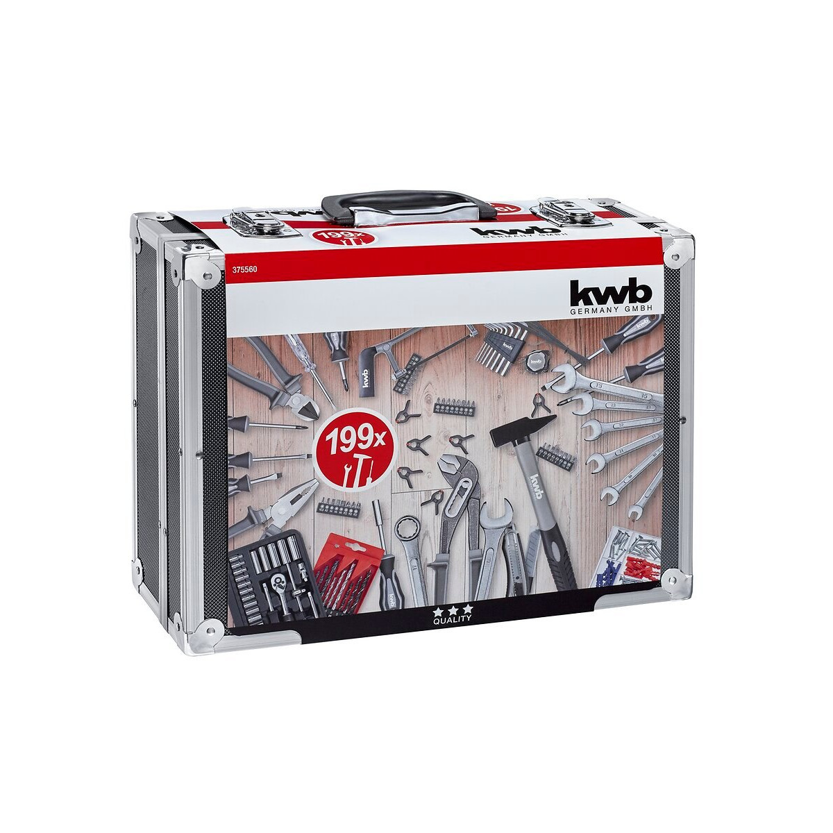 Mallette Outils 199 pcs : Jeu d'outils et accessoires basics 199 pcs - Marteau en fibre manche bi-matière - Pince coupante de côté manche bi-matière - Pince universelle manche bi-matière - Jeu de 9 forêts bois, métal et pierre - Scie avec 3 lames - Pince de robinetterie manche bi-matière - Jeu de 32 embouts - Jeu de vis et chevilles (30 vis, 30 chevilles) - Jeu de 8 clés mixtes - Tournevis PH2, plat 6, manche bi-matière - Tournevis PH1, plat 5, manche bi-matière - Tournevis PH2, flach 4, manche bi-matière - Mètre ruban 3m - Jeu de douilles 25 pcs (3/8 et 1/4) - Testeur de tension - Jeu de tournevis de précisions avec embouts 22 pcs - Cutter auto-bloquant avec 5 lames, manche bi-matière - 4 serre-joints - Jeu de 8 clés mâles - Coffret en aluminium ,