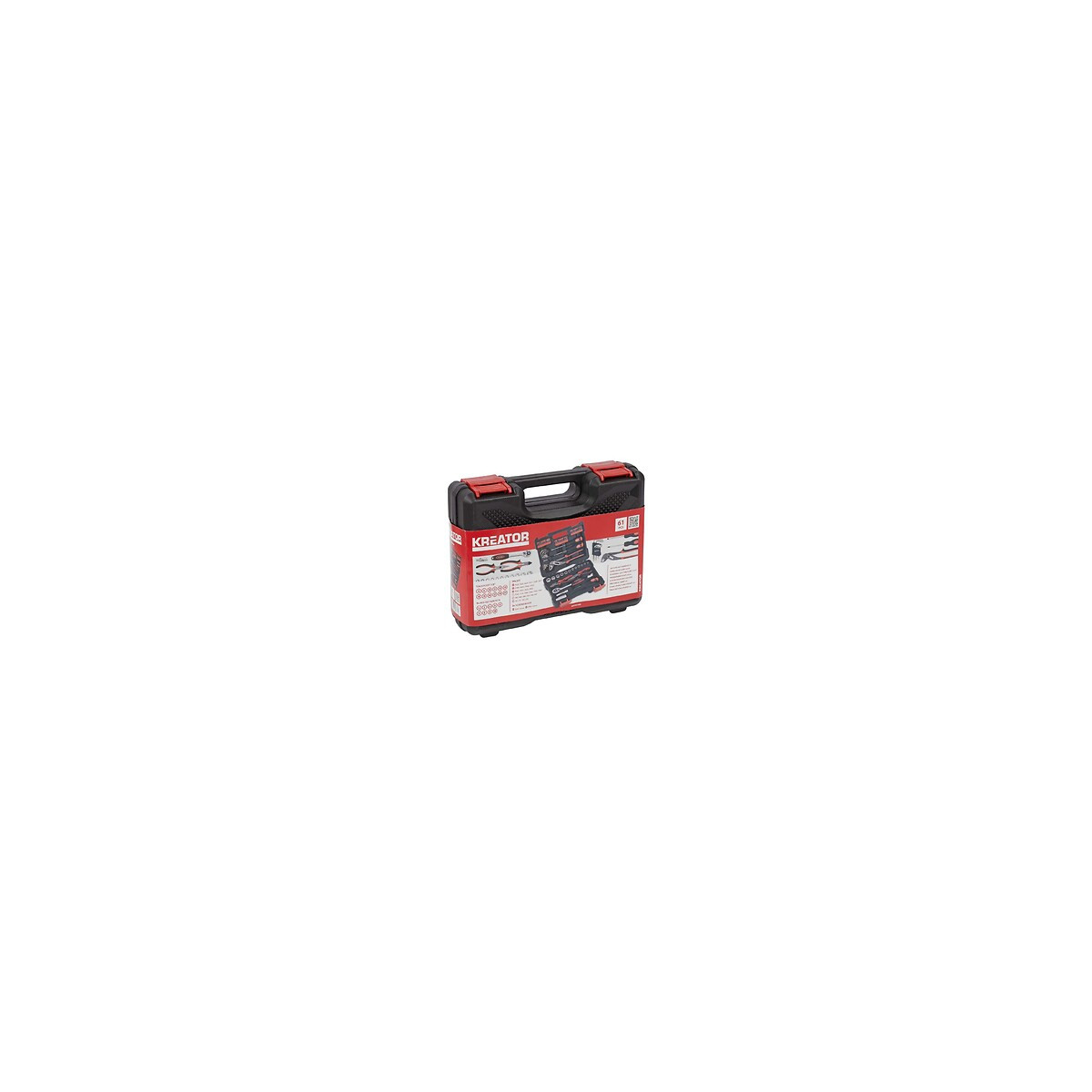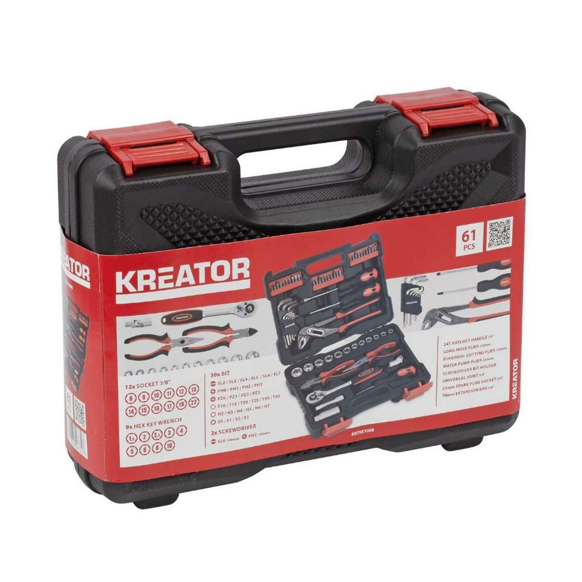 Informations produit: Coffret en plastique robuste Dimensions: 31x25x9 cm Lxlxh Marque: Kreator Contenu du coffret: 12 douilles de serrage 3/8 -8/9/10/11/12/13/14/15/16/17/19/22 mm 2 tournevis SL6/PH2 9 clés Allen de 1,5/2/2,5/3/4/5/6/8/10 mm 6 embouts de vissage tête fendue: SL2/3/4/5/6/7 4 embouts de vissage Philips: PH0/1/2/3 4 embouts de vissage Pozi: PZ0/1/2/3 6 embouts de vissage Torx: T10/15/20/25/30/40 6 embouts de vissage hex: H2/3/4/5/6/7 4 embouts de vissage carré: S01/2/3 mm 1 cliquet 3/8” – 24T 1 pince téléphone 150 mm 1 pince à couper transversale 150 mm 1 pince multiprise 250 mm 1 tournevis à cliquet 1 joint de cardan 3/8” 2 clés à bougie 3/8” – 21 mm 1 extension 70 mm