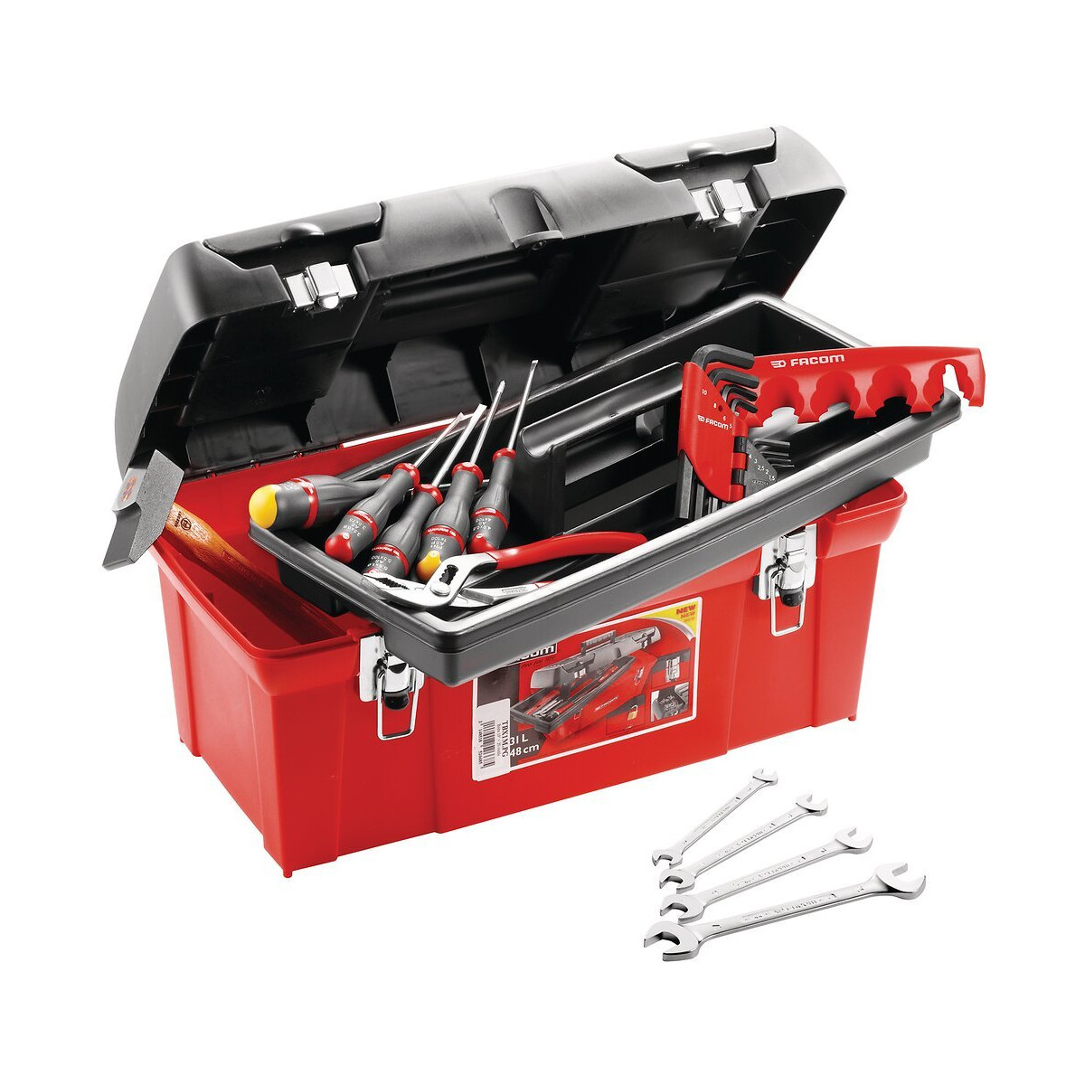 Livré avec : 5 tournevis Protwist 9 clés males courtes sur support 4 clés à fourches dim 8x9-10x11-12x13-16x17 1 marteau rivoir manche hickory 1 pince multiprise gainée