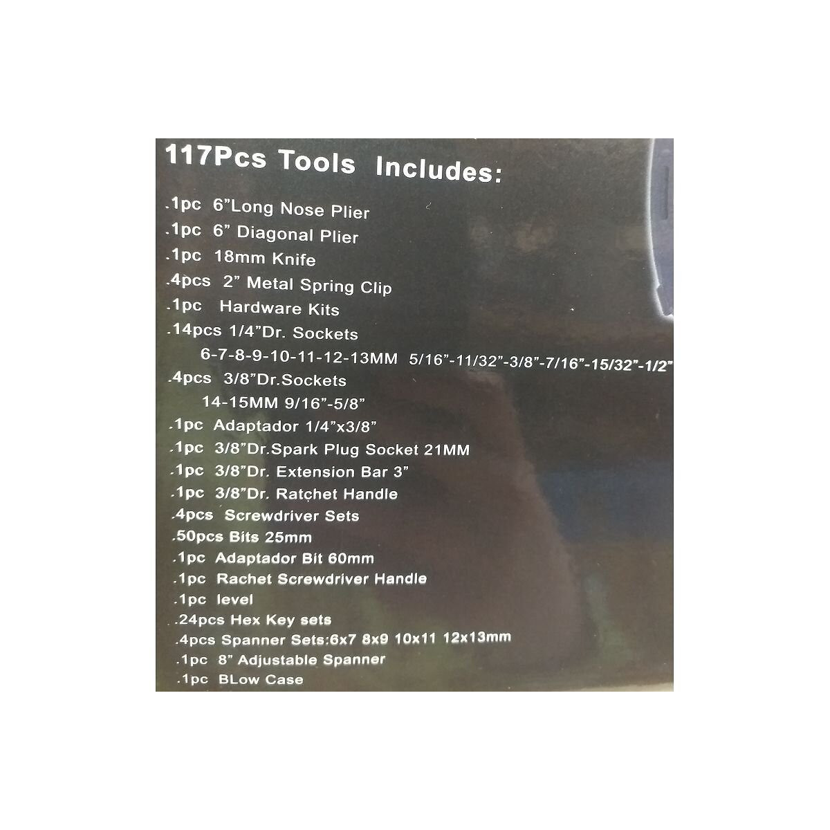Indispensable dans tous les ateliers automobiles professionnels, les ateliers de réparation et les entreprises de fabrication. Fabriqué en acier au chrome-vandium (CrV) - un type d'acier spécial utilisé dans la fabrication d'outils. L'ensemble comprend : des clés à molette, des clés à douille, un cliquet, un jeu de pinces, des pinces, des clés Allen, un couteau, ainsi que des tournevis et des embouts.; CARACTÉRISTIQUES TECHNIQUES: Coffret d'outils 117 pièces; 1x Pince à bec fin; 1x Pince latèrale; 1x Couteau à tapisser; Douilles 1/4" : 6 mm, 7 mm, 8 mm, 9 mm, 10 mm, 11 mm, 12 mm, 13 mm ;; Douilles 3/8" : 14mm, 15mm ;; 1x Adaptateur 1/4" - 3/8"; 1x Clé à cliquet; 4x Tournevis de précision; Embouts de 25 mm : plat/étoile/ Phillips/ torx; 1x Clé à molette 8"; 1x Mini niveau à bulle; Clés Allen; 4x Clés combinées : 6-7mm ; 8-9mm ; 10-11mm ; 12-13mm; 1x Pince 8"; 1x Tournevis à cliquet pour embouts; 4 pinces de charpentier; Mallette de transport en plastiqueSpécifications techniques