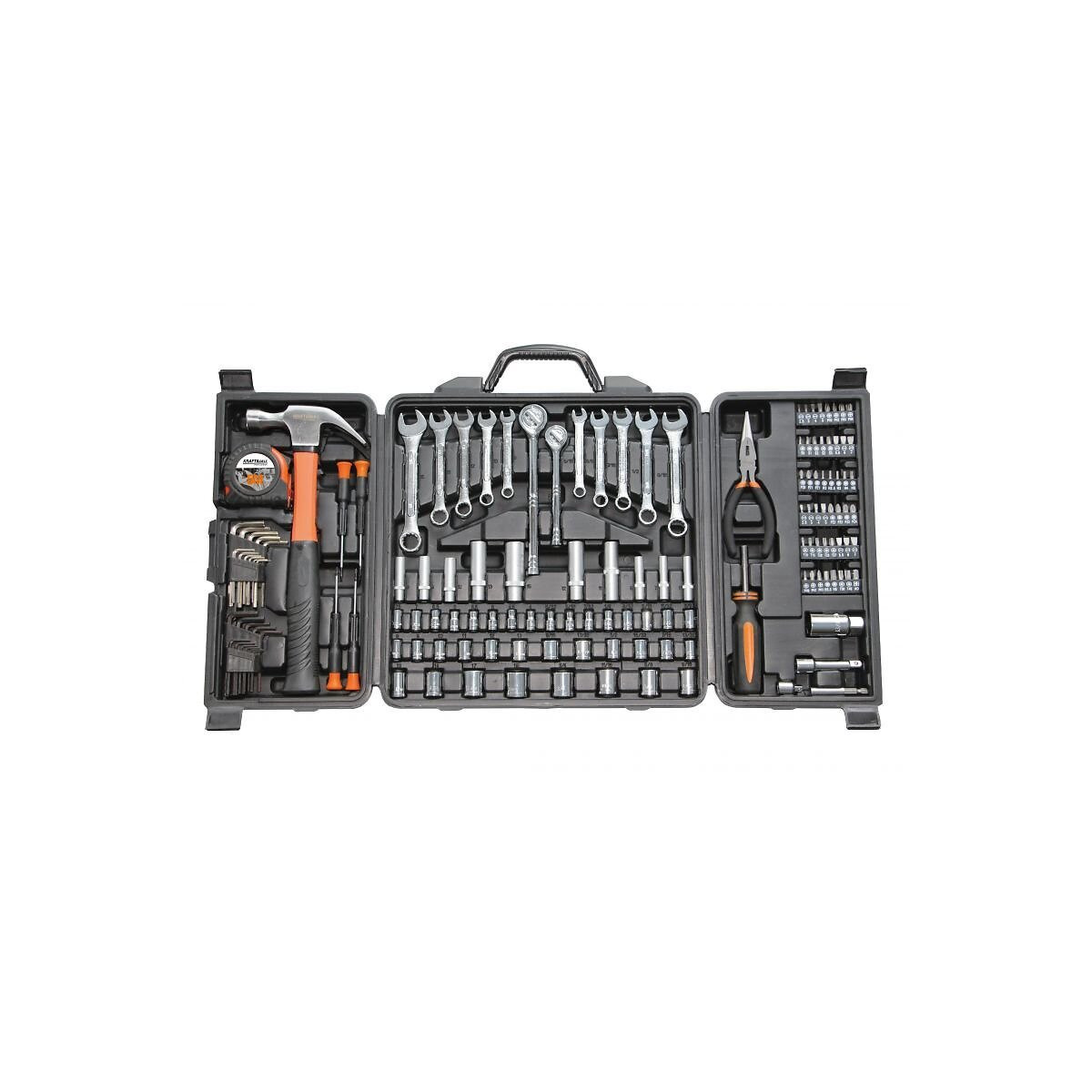 Un ensemble de 140 outils dans une mallette pratique : Mètre à ruban 5m, Marteau à griffes, Clés hexagonales 22 pcs : .27/1.5/2/2.5/3/3.5/4/4.5/5/5.5/6mm, 1/20", 1/16", 5/64", 3/32", 7/64", 1/8", 9/64", 5/32", 3/16" 7/32", 1/4", Tournevis de précision PH 0x50/PH 1x50/SL2.4x50/SL3.0x50mm, Clés combinées: 8-10-12-13-15mm, 5/16"-3/8"-7/16"-1/2"-9/16", Poignées de douilles à cliquet 1/4" et 3/8", Douilles profondes de: 3/8" 11/12/13/15mm, Douilles profondes: 1/4" 5/6/7/8/9/10mm, Douilles profondes 1/4", 4/4.4/5/5.5/6/6.5/7/7.5/8/9/10/11/12/13mm, 5/32"-3/16"-7/32"-1/4"-9/32"-5/16"-11/32"-3/8"-13/32"-7/16"-15/32"-1/2"-17/32"-9/16", 8 douilles de 3/8" de diamètre: 13/14/17/19mm, 9/16"-5/8"-11/16"-3/4, Pince à long bec 6", Manche de tournevis 50mm, Ensemble d'embouts 1/4": 25mm/10PC-SL(3-4-5-5.5-6)mm, T10-T15-T20-T25-T27-T30-T40, 2-2.5-3-4-5-5.5-6mm, 3/8" Spak Plug Socket 21mm, 3/8" Barre d'extension, Barre d'extension pour vis 60mm, Adaptateur 3/8(F)*1/4(M); CARACTÉRISTIQUES TECHNIQUES: 140 outils differents; Valise pratique; En CrVSpécifications techniques