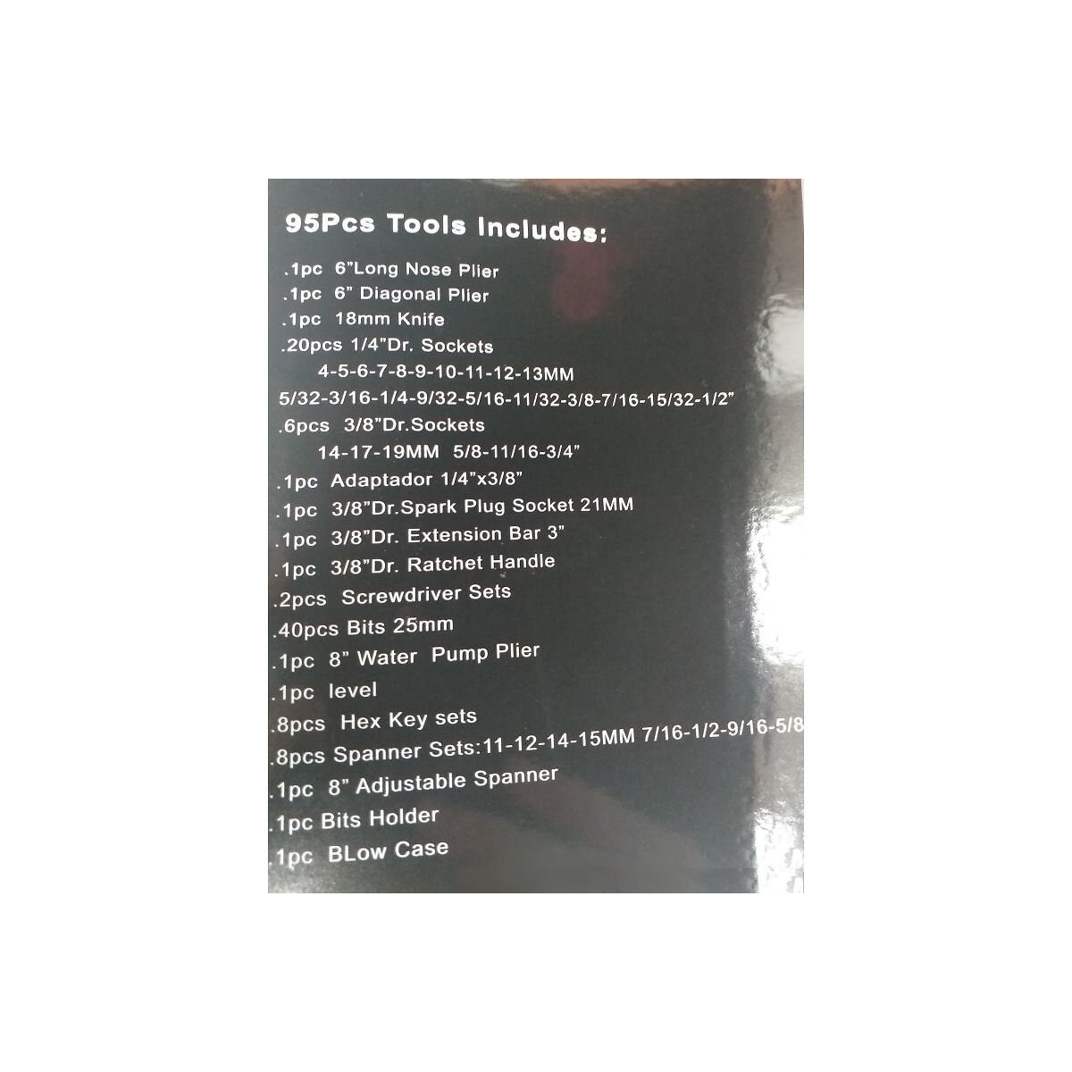 Indispensable dans tous les ateliers automobiles professionnels, les ateliers de réparation et les entreprises de fabrication. Fabriqué en acier au chrome-vandium (CrV) - un type d'acier spécial utilisé dans la fabrication d'outils. L'ensemble comprend : des clés à molette, des clés à douille, un cliquet, un jeu de pinces, des serre-joints, des clés Allen, un couteau, ainsi que des tournevis et des embouts.; CARACTÉRISTIQUES TECHNIQUES: Coffret d'outils 95 pièces; 1x niveau à bulle; 10x douille hexagonale métrique 1/4" (4mm, 5mm, 6mm, 7mm, 8mm, 9mm, 10mm, 11mm, 12mm, 13mm); 10x douilles hexagonales 1/4" (5/32", 3/16", 1/4", 9/32", 5/16", 11/32", 3/8", 7/16", 15/32", 1/2"); 3x douille hexagonale métrique 3/8". (14mm, 17mm, 19mm); Douilles hexagonales 3/8" 3x pouces (11/16", 5/8", 3/4"); 10x bits (T10, T15, T20, T25, T27, T30, PZ0, PZ1, PZ2, PZ3); Bit 10x (2, 2.5, 3, 4, 5, 6, 7, PH2, PH3, AD); 10x bits (H1.5, H2, H2.5, H3, H4, H5, H5.5, H6, PH0, PH1); 10x bits (4, 4, 6, 6, PH1, PH1, PH2, PH2, PZ1, PZ2)Spécifications techniques
