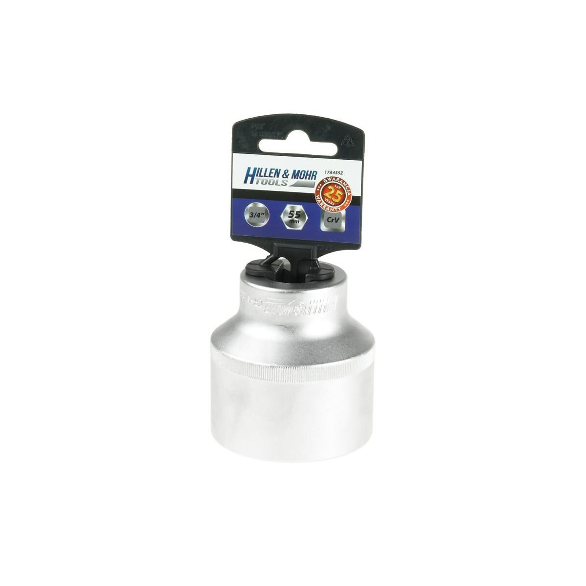 La douille est faite en acier au chrome vanadium, ce qui lui confère une résistance et une dureté élevées. Surface de la douille satinée. Douille pour cliquets, clés, joints et extensions avec support de montage de 3/4". La partie intérieure de la douille est hexagonale, ce qui garantit une bonne assise de la douille sur le composant à visser ou à serrer, CARACTÉRISTIQUES TECHNIQUES: Taille : 60 mm, Mandrin : 3/4"