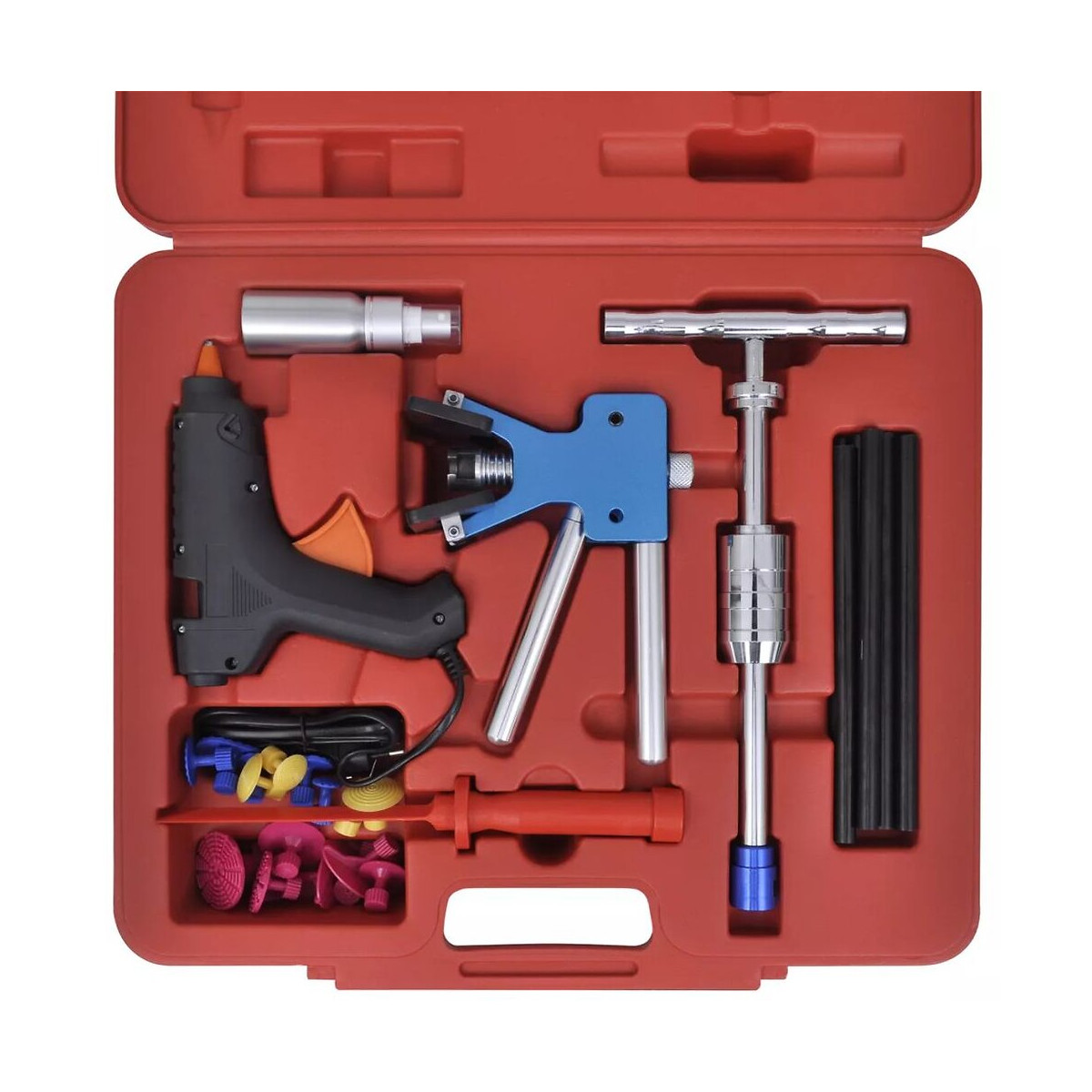 Ce kit de débosselage est un ensemble d'outils essentiel du fait de son prix raisonnable et de sa conception multifonction. Ce kit de débosselage permet de réparer en toute sécurité les bosses, les coups et les impacts de grêle presque partout sur tout véhicule sans affecter la peinture d'origine. Il permet d'économiser de l'argent et est une alternative économique aux réparations couteuses effectuées par les carrossiers professionnels. Ce kit de débosselage comprend tous les outils nécessaires pour éliminer les bosses: 1 pince à débosselé, 1 marteau, 1 pistolet à colle, 1 bouteille, 1 racloir, 8 bâtons de colle et 19 languettes à coller. Une mallette moulée rouge est également incluse pour faciliter le stockage et le transport. Contenu du kit de débosselage: 1 x pince à débosselé (corps bleu) 1 x marteau à inertie en acier (surface chromée) 1 x pistolet à colle 40 W 1 x bouteille avec autocollant 1 x racloir 8 x bâton de colle noir 19 x languette à coller (rouge + bleu + jaune) Une mallette moulée rouge est incluse pour faciliter le stockage et le transport