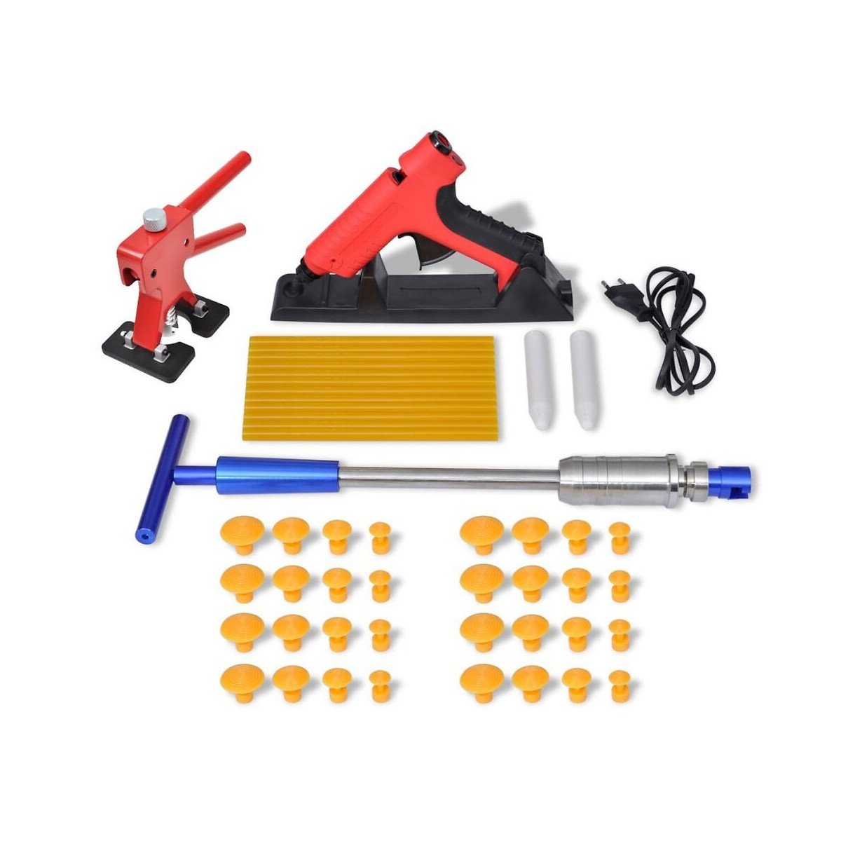 Ce kit de débosselage est un kit d'outils essentiel pour toute famille possédant une voiture en raison de son prix raisonnable et de sa conception polyvalente. Ce kit de débosselage comprend tous les outils nécessaires dont vous avez besoin pour débosseler votre véhicule: 1 pince de traction, 8 sets de languettes à coller (32 au total), 1 pistolet à colle sans fil avec 12 bâtons de colle, 2 pointeaux redresseurs et 1 marteau. Ce kit permet de débosseler presque toutes les parties de votre véhicule. Il vous permet d'économiser de l'argent et est l'alternative économique aux coûteuses réparations effectuées par les carrossiers professionnels. Ce kit de débosselage comprend: Pince de traction (rouge et noir) 32 x languette à coller (8 sets, jaune) 1 x pistolet à colle sans fil (rouge et noir) avec 12 bâtons de colle jaunes 2 x pointeau redresseur (blanc) 1 x marteau (bleu et argent)Spécifications techniques