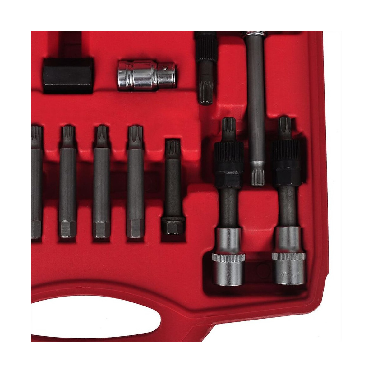 Il permet un retrait facile de la poulie d'alternateur. Acier chrome vanadium. Le kit permet également l'arbre de l'alternateur qui aura lieu pendant le dispositif de retenue de poulie est enlevée. Adaptateurs pour toutes les principales marques de véhicules. 1 x T50 T-Profil Bit Socket, 1/2 ", 33T-110 mm, s'inscrit Mercedes, A-Klasse 3 x M10 Spline des douilles, 1/2 ", de 33T-110mm (FITS BMW, Ford, Mercedes, VAG); 31T-98mm (FITS Fiat); 110mm (taille universelle); 1 x T50 bit T-profil, 75mm, ajustement universel 1 x T40 bit T-profil, 75mm, ajustement universel 1 x M8 interne Bit XZN des dentelures, 75mm, ajustement universel 1 x M10 interne Bit XZN des dentelures, 75mm, s'adapte Renault 1 x 10mm interne dentelure Bit XZN, 75mm, ajustement universel 1 x 8mm interne Bit XZN des dentelures, 75mm, ajustement universel 1 x M10 bits HEX 14mm spline, 57mm, s'adapte Renault, BMW, Ford, Mercedes, Porsche, Opel, VAG; Usage spécial alternateur: 1 x 33T-22 mm, s'inscrit Renault, Mercedes; 1 x 33T-17mm, ajustement universel; 1 x 19mm, ajustement universel; 1 x 22mm, ajustement universel; 1 x 21mm, s'adapte Renault, BMW, Ford, Mercedes, Porsche, Opel, VAG; 1 x alternateur 4 pôles, ajustement universel; 1 x 33T-15mm, s'adapte Ford; 1 x 17mm, s'adapte Ford; 1 x 38mm, 3 broches, s'adapte Toyota; 1 x H28 x H22mm, s'adapte Porche 1 x Adaptateur bits pour les bits 10mm, 1/2 "DRIVE, ajustement universelSpécifications techniques
