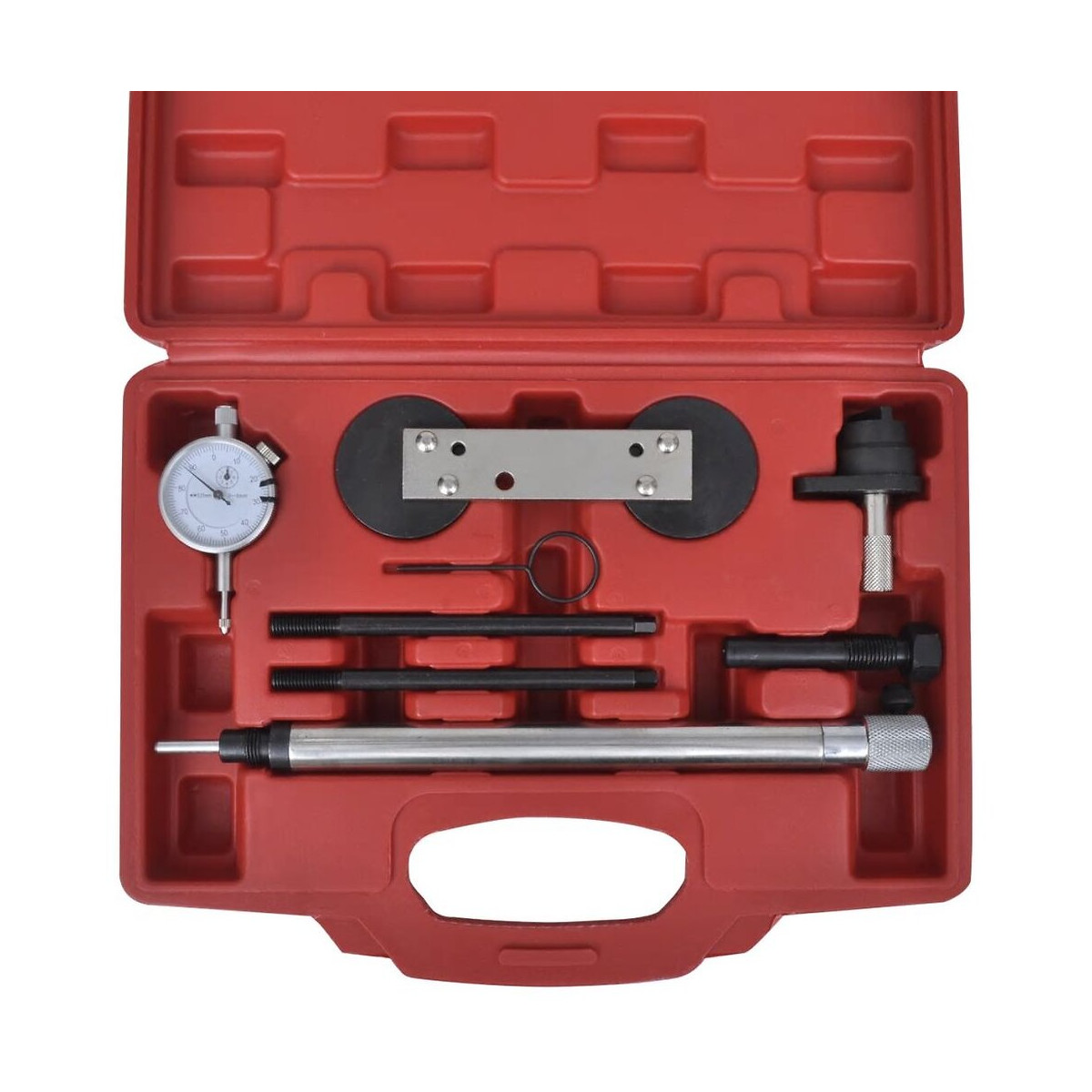 Cet kit d'outils de synchronisation du moteur de haute qualité est conçu pour des réparations professionnelles de moteur, par exemple, l'installation et l'enlèvement de l'arbre à cames, le remplacement des chaînes de distribution, le contrôle et le réglage du calage de l'arbre à cames, le changement du joint de culasse, etc. Fabriqués avec des normes élevées, ce kit est suffisamment robuste pour une utilisation quotidienne dans l'atelier. Le kit est livré dans une mallette moulée par soufflage pour facilité le stockage et le transport. Dimensions du kit: 30 x 22 x 6,5 cm (L x P x H) Pour une réparation professionnelle du moteur Construction solide Livré dans une mallette moulée par soufflage pour faciliter le stockage et le transport Contenu du kit: Verrou à came pour être utilisé comme OEM T10414 Goupille de verrouillage du pignon de villebrequin pour être utilisée comme OEM T10341 Outil de fixation de l'arbre à cames pour être utilisé come OEM T10171 Goupille de verrouillage pour être utilisée comme OEM T40011 Cadran circulaire avec affichage analogique de 41 mm de diamètre, précis à 0,01 mm Douille de serrage, 8 mm Porte-indicateur avec 274 mm de longueur totale, filetage extérieur M14 x 1,25 mm, pour fixer le point mort haut 2 broches de guidage avec une longueur de 135 mm, 24 mm de long, filetage M8 x 1,25 mm, clé hexagonale externe 6 mm Convient pour: Moteur VAG 1.2 liter TSI: Avec code moteur CBZA, CBZB et CBZC Par exemple Audi A1, A3, A3 Sportback et A3 Cabriolet Par exemple Seat Altea, Altea XL, Ibiza, Ibiza Sport Coupe, Leon et Toledo Par exemple Skoda Fabia, Fabia, Octavia, Rapid, Roomster et Yeti Par exemple VW New Beetle, Caddy, Golf, Golf Plus, Golf Cabriolet, Golf Variant, Jetta, Polo et Touran Moteur VAG 1.4 FSI: Par exemple VW Golf 4 et 5 et Polo 9N Moteur VAG 1.6 FSI: Avec code moteur AXU, BAG, BKG, BLF, BLN et BLP Par exemple Audi A3, VW Golf, Passat et TouranSpécifications techniques