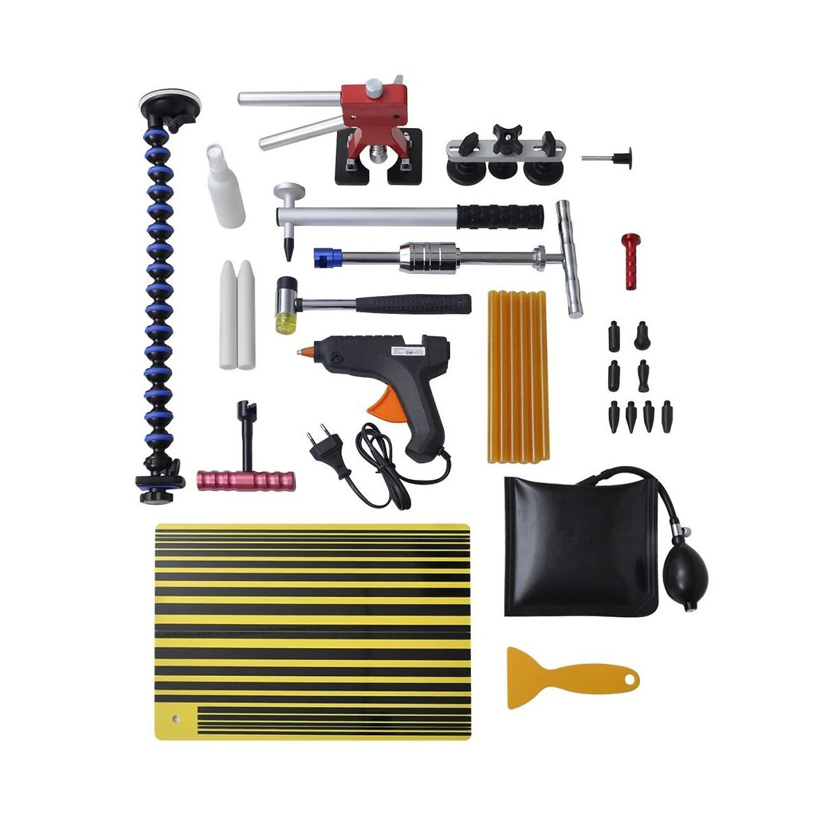 Ce kit de débosselage sans peinture contient tout ce dont vous avez besoin pour le débosselage sans peinture (DSP). Ce kit contient tous les outils essentiels pour le débosselage : un panneau à ligne, un ensemble pistolet à colle, une pince à débosseler et un set de frappe. Avec cet ensemble, vous pouvez supprimer les bosses presque partout sur tous les véhicules. Il est livré dans un sac pour facilité le transport et le stockage. Contenu du kit de débosselage : 1 marteau à inertie 1 pince à débosseler 1 pistolet à colle 40 W 32 languettes à coller (rouge + bleu + jaune) 6 bâtons de colle (jaune - 1,1 x 20 cm) 2 outils de frappe (blanc) 1 bouteille de dissolvant (flacon en plastique blanc 60 ml) 1 set de frappe avec 8 embouts différents 1 marteau 1 marteau (25 mm) 1 grattoir en plastique 1 extracteur de bosse 1 mini barre en T 1 panneau à lignes (jaune + noir) 1 coussin gonflable (noir) 1 sac de transport (rouge + noir)Spécifications techniques