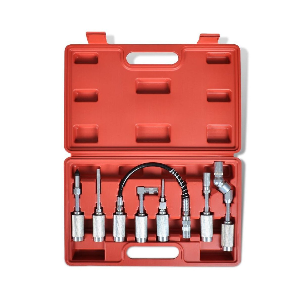 Ce kit d'outils se compose d'adaptateurs et d'extensions pour faciliter votre travail. Il est conçu pour convenir à la plupart des pompes à graisse manuelles. La livraison incluse: tube de lubrification de 90 degrés, adapteur de rallonge droit, tuyau d'extension de 400 mm, coupleur de 90 degrés, buse avec embout en caoutchouc, buse à aiguille et coupleur de 360 degrés. Tous les outils sont bien rangés dans une mallette robuste pour un transport facile. Matériau: Acier Livraison incluse: Tube de lubrification 90 °, long de 110 mm Coupleur 360 ° réglable Tuyau d'extension renforcé pour coupleur, long de 400 mm Tuyau d'extension à rallonge droite, long de 150 mm, 8 mm de diamètre Coupleur 90 ° Buse à aiguille, long de 135 mm, 5 mm de diamètre Buse avec embout en caoutchouc, long Fr 160 mm, 10 mm de diamètre,