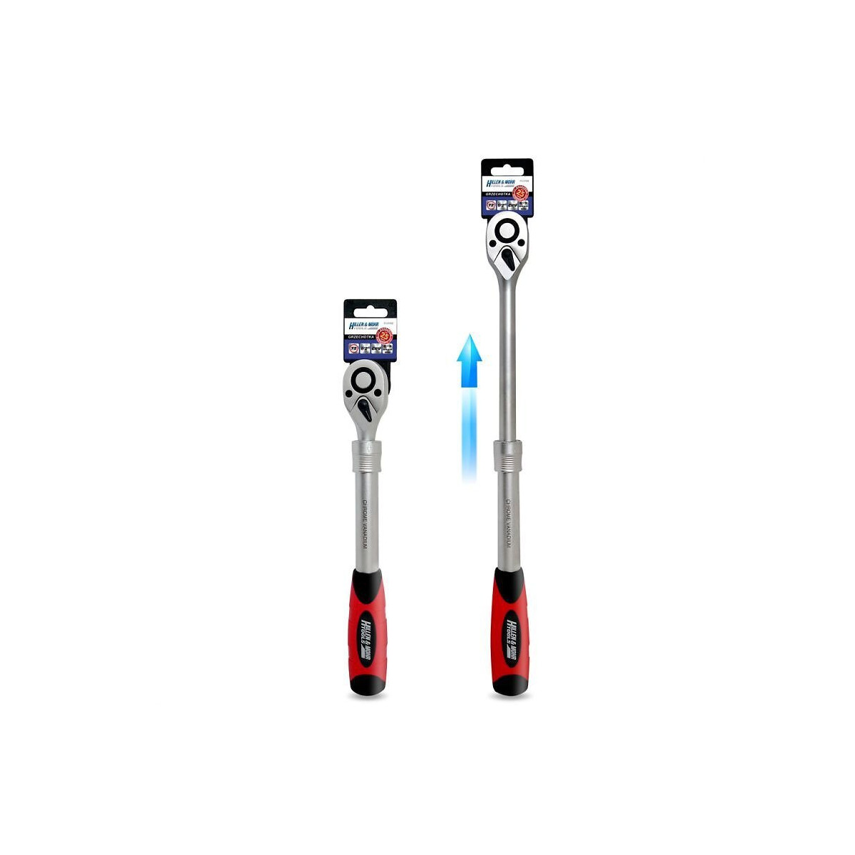 Le cliquet droit en acier CrV (chrome-vanadium) qui assure une solidité et une résistance à la corrosion adéquates. Le mécanisme du cliquet comporte 72 dents, de sorte que le cliquet a une faible course et qu'un serrage précis est possible. Le cliquet est doté d'un commutateur de direction de travail et d'un bouton de déverrouillage de la douille, CARACTÉRISTIQUES TECHNIQUES: Longueur de l'outil 305-445 mm