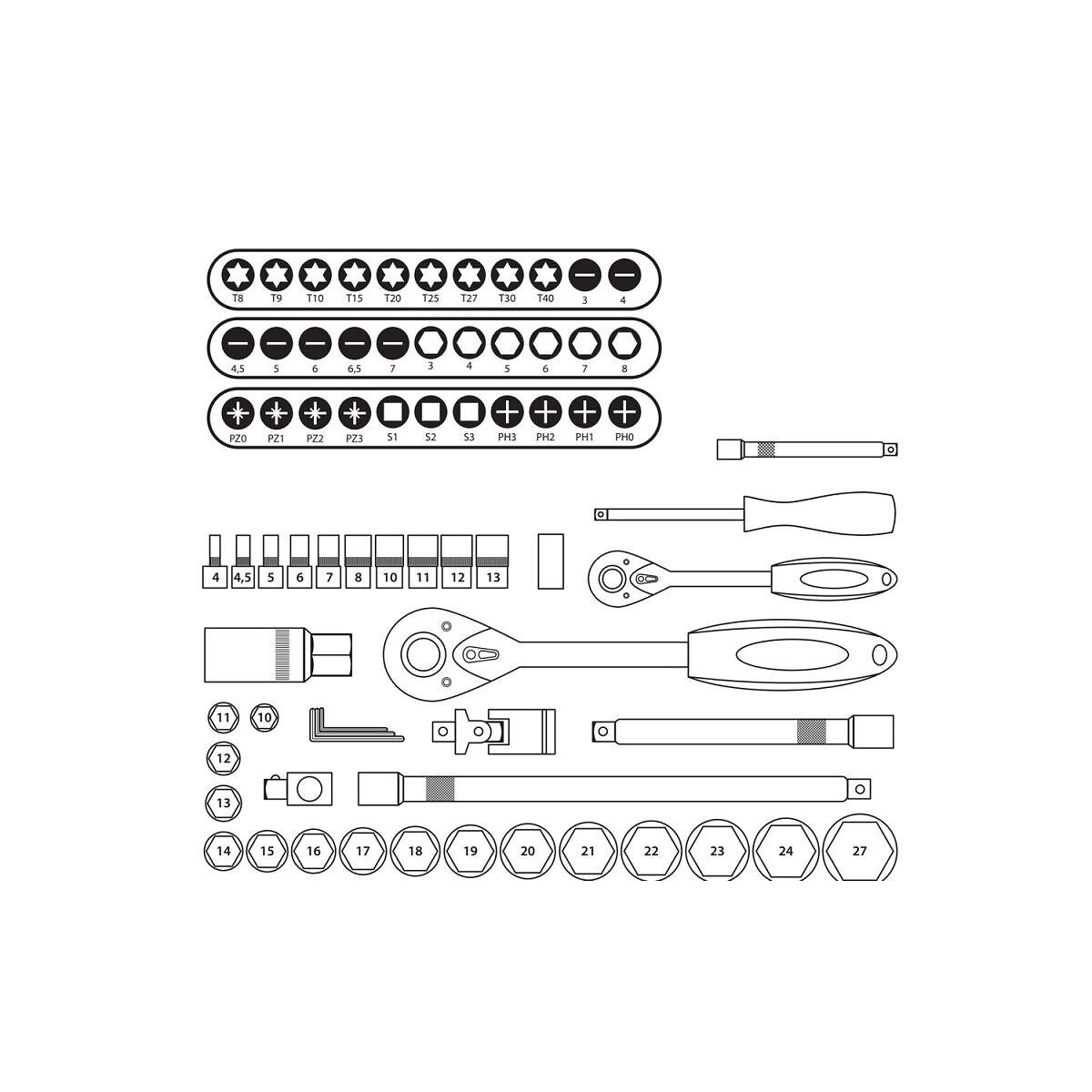 Le jeu de clés à douille à haute résistance mécanique et à très haute résistance à l'usure. Le jeu de clés est utilisé dans les ateliers professionnels et domestiques. L'ensemble se compose de 72 éléments emballés dans une mallette pratique résistante aux chocs, CARACTÉRISTIQUES TECHNIQUES: Jeu de 72 clés à douille, Dimensions de fixation : 1/2 et 1/4 pouce, Douille hexagonale, Bout magnétique, Poids : 1.23 kgSpécifications techniques