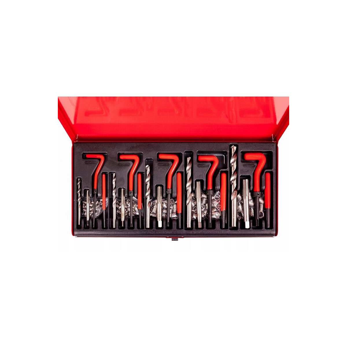 Coffret contenant 131 accessoires en acier trempé de la plus haute qualité. Ils sont idéals dans chaque atelier et chaque garage. Ils sont utiles lors de la réparation de filetages de tout type et de la plupart des matières. Coffret très universel grâce a son grand nombre d'accessoires. Tous les accessoires sont fabriqués avec une matière de la plus haute qualité : de l'acier HSS d'un niveau élevé. Cela leur assure une résistance pour une longue période. Chaque accessoire est rangé à sa place dans une mallette solide en métal qui permet de maintenir un rangement optimal.; CARACTÉRISTIQUES TECHNIQUES: 131 accessoires; CONTENU : 5 broches de pose, 5 tarauds, 1 clé Allen, 5 rupteurs HSS4341, 110 filets rapportés, mallette en métal avec des emplacements prévus, mallette solide en métal.