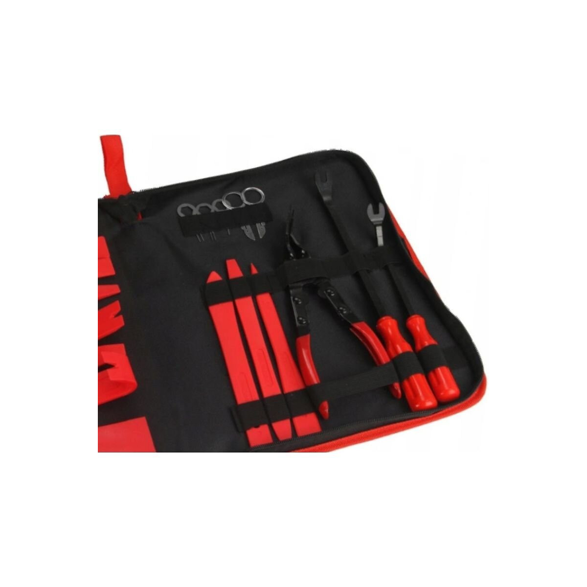 Outils spéciaux pour démonter les garnitures de portes et les baguettes de carrosserie. Ils sont en nylon renforcé. Leur forme particulière rend possible l'utilisation d'un levier lors du démontage des agrafes de garnitures. Le grand choix d'outils permet de sélectionner celui qui est adéquat afin d'éviter de casser la spatule et de rayer ou d'endommager la garniture intérieure.; CARACTÉRISTIQUES TECHNIQUES: Nombre d'outils compris dans le kit : 19; Poids : 2 kg; Produits très solides avec une finition de haute qualité.; Simples d'utilisation.; Résistants aux déformations.Spécifications techniques