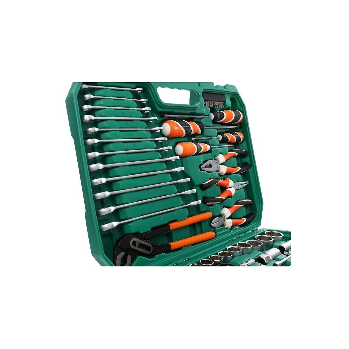 Un set d'outils extrêmement étendu. Les outils se caractérisent par leur fabrication robuste, des matériaux durables et un étui pratique dans lequel chaque outil a sa propre place. Pour encore plus de commodité, l'ensemble comprend un jeu de cliquets à 72 dents. Le set se compose de 122 pièces différentes afin de garantir un outil adapté à chaque besoin. Les outils sont faits en acier chrome vanadium (CrV) trempé destiné aux outils d'atelier. Chaque outil a son propre emplacement, ce qui permet de trouver facilement la taille de clé dont vous avez besoin; CARACTÉRISTIQUES TECHNIQUES: Set d'outils complet; Le set comprend : clés à douille, torx, allen, pinces et tournevis; 122 pièces