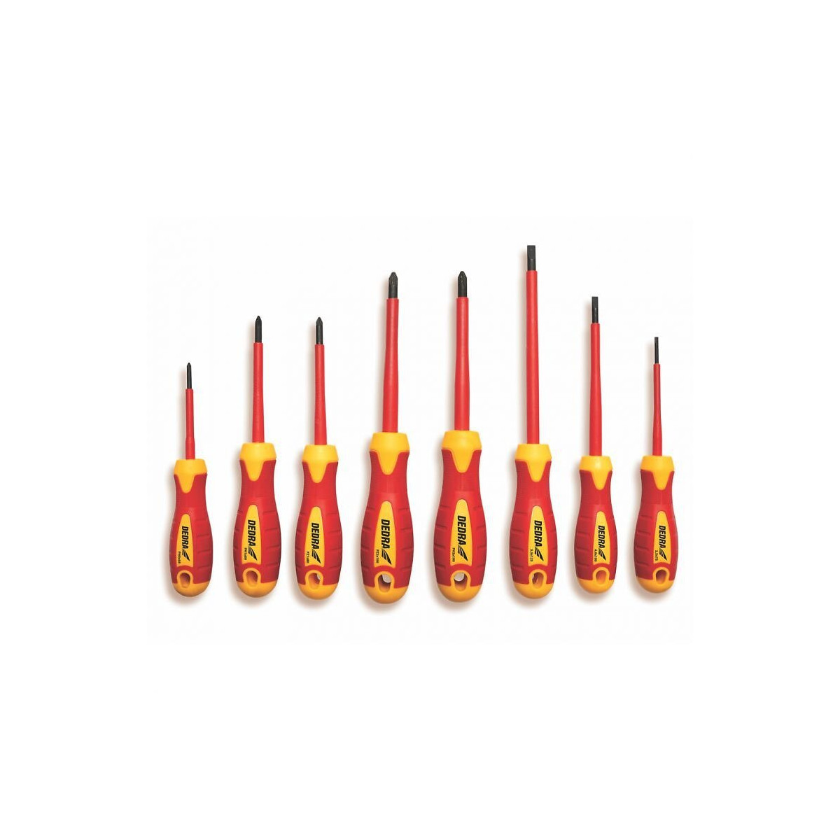C'est un jeu de 8 tournevis isolés de précision pour les travaux d'électricité. Les tournevis protègent contre les tensions jusqu'à 1000V. Les tournevis sont faits en acier au carbone, ce qui garantit une dureté et une durabilité appropriées. La poignée en caoutchouc confortable offre à l'utilisateur une prise sûre pendant le travail. De plus, les tournevis sont dotés de pointes magnétiques, ce qui facilite considérablement le vissage et le dévissage, CARACTÉRISTIQUES TECHNIQUES: Jeu de 8 tournevis isolés, Matériau : acier S2, poignée en TPR bi-matière