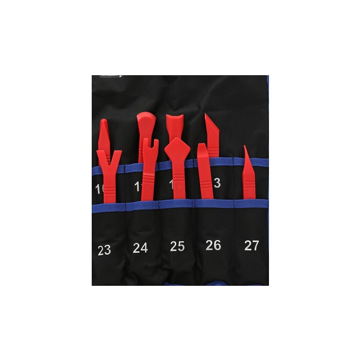 Outils spéciaux pour démonter les garnitures de portes et les baguettes de carrosserie. Ils sont en nylon renforcé. Leur forme particulière rend possible l'utilisation d'un levier lors du démontage des agrafes de garnitures. Le grand choix d'outils permet de sélectionner celui qui est adéquat afin d'éviter de casser la spatule et de rayer ou d'endommager la garniture intérieure.; CARACTÉRISTIQUES TECHNIQUES: Matière : nylon; Nombre d'outils compris dans le kit : 27; Produits très solides avec une finition de haute qualité.; Simples d'utilisation.; Résistants aux déformations.