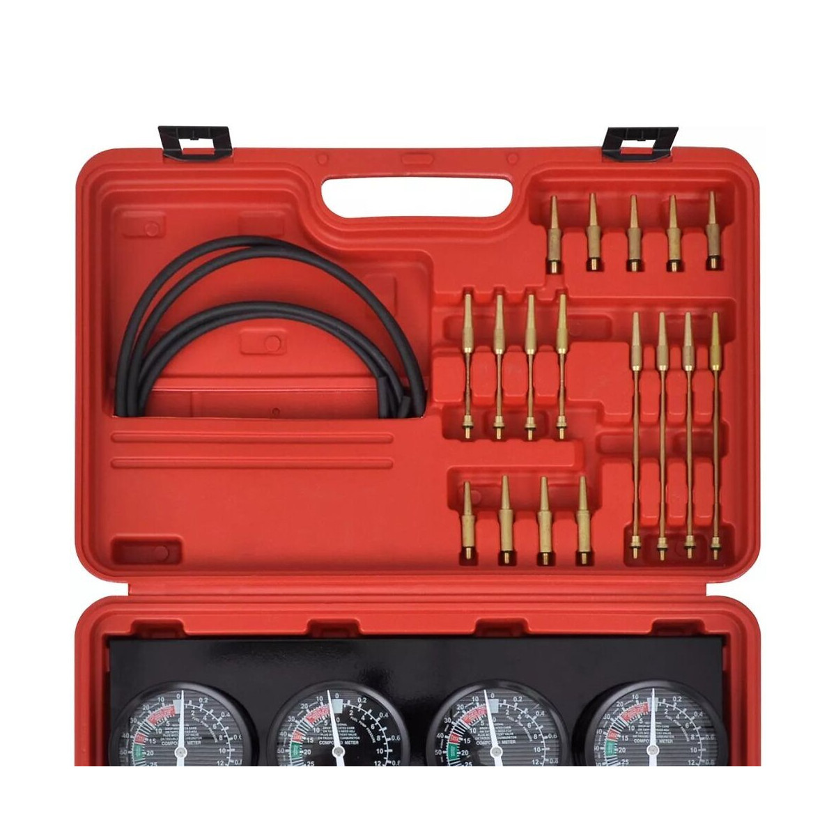 Ce kit vous permet de synchroniser les valeurs de 4 carburateurs, ainsi que de les ajuster ou paramétrer. Chaque jauge a son propre réglage d'amortissement individuel et système d'étalonnage. Fait en matériau de haute qualité, ce kit d'outils est très solide. Le kit est livré dans une mallette moulée par soufflage pour facilité le stockage et le transport. Dimensions du kit: 45 x 30 x 9,5 cm (L x P x H) Livré dans une mallette moulée par soufflage pour faciliter le stockage et le transport Construction solide et durable pour une longue durée de vie Le kit comprend: 4 jauges de synchronisation avec plaque fixe (sous vide) 4 tuyaux en caoutchouc 8 x 750 mm 4 tubes de rallonge de 3,9 x 52 mm et 4 tubes 3,9 x 122 mm 8 tubes avec connecteur conique 8 x 40 mm 4 tubes de 10 x 53 mm (M6 x 0,75) 4 tubes de 10 x 60 mm (M6 x 1,0)