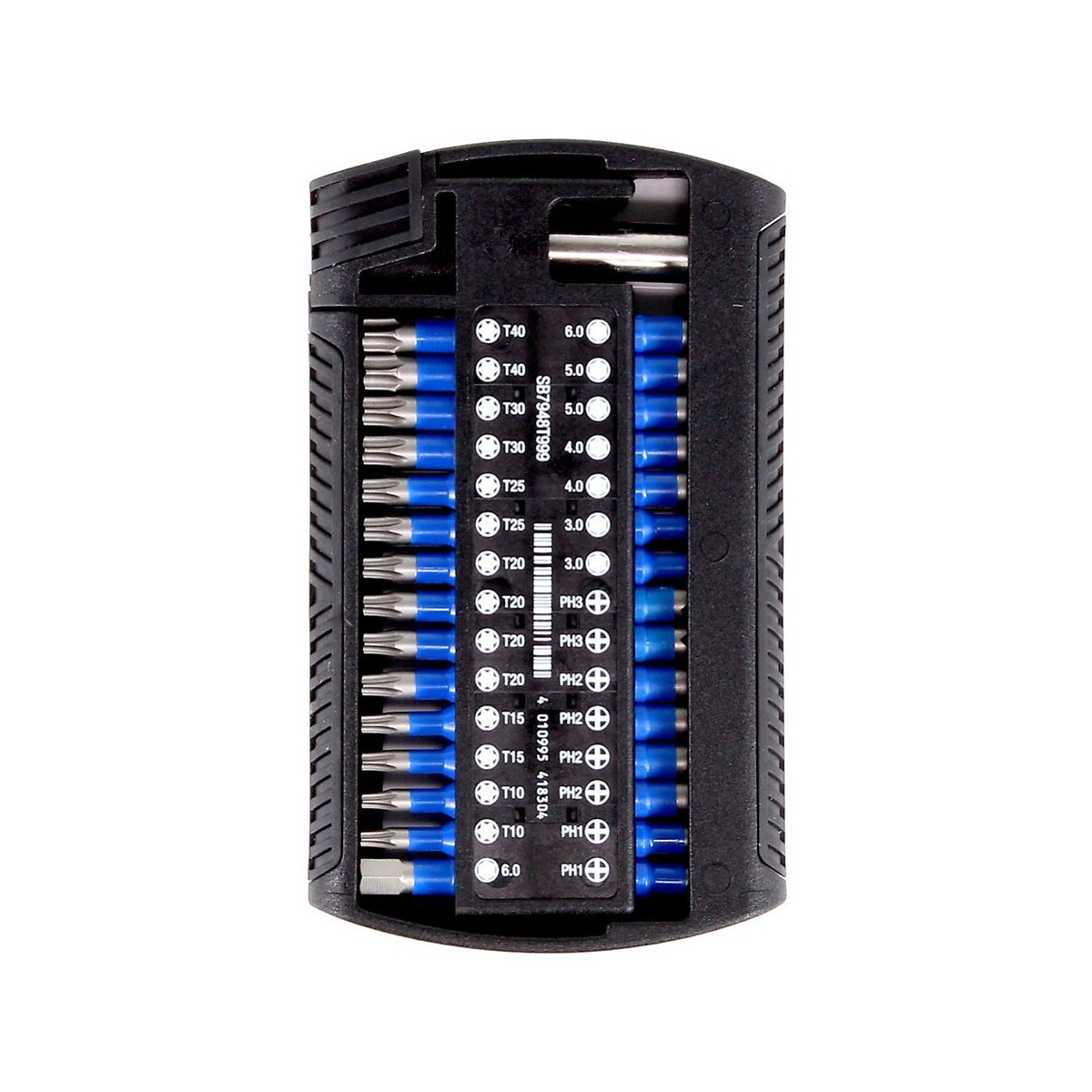 Contenu du paquet: - 2x T-Bit 25 mm, Phillips: PH1, Longueur embout: 25mm - 4x T-Bit 25 mm, Phillips: PH2, Longueur embout: 25mm - 2x T-Bit 25 mm, Phillips: PH3, Longueur embout: 25mm - 2x T-Bit 25 mm, TORX®: T10, Longueur embout: 25mm - 2x T-Bit 25 mm, TORX®: T15, Longueur embout: 25mm - 4x T-Bit 25 mm, TORX®: T20, Longueur embout: 25mm - 2x T-Bit 25 mm, TORX®: T25, Longueur embout: 25mm - 2x T-Bit 25 mm, TORX®: T30, Longueur embout: 25mm - 2x T-Bit 25 mm, TORX®: T40, Longueur embout: 25mm - 2x T-Bit 25 mm, Six pans creux: SW3, Longueur embout: 25mm - 2x T-Bit 25 mm, Six pans creux: SW4, Longueur embout: 25mm - 2x T-Bit 25 mm, Six pans creux: SW5, Longueur embout: 25mm - 2x T-Bit 25 mm, Six pans creux: SW6, Longueur embout: 25mm - 1x Porte-embout magnétique (41922), Six pans extérieur: 1/4 mm, Six pans intérieur: 1/4 - 1x XLSelector Wiha Description du produit: Jusqu'à présent, à l'achat d'un embout, il n'était pas clair quels embouts conviennent pour quelle application. Wiha met fin à la complexité entre la machine utilisée, le cas de vissage et le grand choix d'embouts différents. Grâce au concept révolutionnaire d'embout de Wiha, seule la forme de vis est déterminante pour la sélection de l'embout correct.L'embout en T est ainsi idéal pour le vissage de vis en forme de T avec un angle de 90° entre le filetage et la tête de vis. Grâce à la zone de torsion allongée, brevetée, l'embout convient également pour les vissages à impact et visseuses à chocs et garantit une durée de vie 120x plus élevée en comparaison avec les embouts standard Wiha. Par ailleurs, il est facile et rapide de retrouver les embouts colorés, également dans le noir avec lumière UV grâce au manteau coloré. Ceci permet de diminuer le nombre d'embouts perdus et d'économiser les coûts de réapprovisionnement. Les embouts dans les entraînements les plus courants sont rangés de manière compacte et peu encombrante dans le XLSelector. Spécifications techniques: Numéro de commande: 41830 Poids: 270 g Dimensions de l'emballage (L x l x H): 190 x 110 x 25 mm