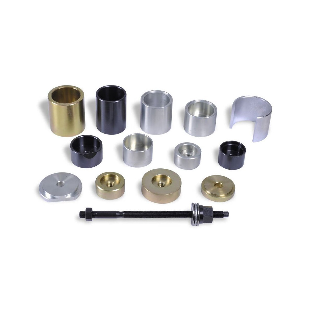 C'est un outil professionnel pour un usage commercial ou de bricolage. Le kit est une aide idéale pour le démontage et l'installation des paliers, des roulements à billes et des coussinets de nombreux modèles BMW de la série 1 à la série 8. Cet ensemble d'outils de roulements silencieux est conçu pour une longue durée de vie dans l'utilisation quotidienne en atelier et classé en catégorie industrielle. Tous les outils sont triés dans un boîtier moulé par soufflage pour faciliter le stockage et le transport. Jeu d'outils de palier silencieux pour BMW, 16 pièces Permet le renouvellement des coussinets en caoutchouc de la suspension Comprend diverses pièces d'impression, tige et fuseaux Convient aux véhicules de BMW, modèles de la série 1, par exemple, E81, E87 ; série 3 E36, E46, E83, E90, E91, E92, E93 ; modèles de la série 5 E60, E61, E63 ; modèles de la série 6, E64, E38 ; modèles de la série 7, E65, E66, E67 ; modèles de la série 8 E31, E85 Z4, E86 et modèle Mini Cooper S R53 Une tige d'alimentation de 225 mm pour actionner les inserts de roulement silencieux avec filetage M12 x 1,5 mm de long, à l'extrémité de la broche avec filetage M12 x 1,5 mm court, avec clé hexagonale de 8 mm Le filetage de mouvement sur la broche et le roulement à rainure axiale sur la pièce de pression provoquent des performances élevées du train et de la pression avec un effort minimum (couple) Un écrou de broche avec filetage M12 x 1,5 mm, avec clé hexagonale de 19 mm Un écrou de compression avec roulement à rainure axiale, filetage intérieur M12 x 1,5 mm, avec la taille de la clé d'entraînement hexagonal de 24 mm Placettes de pression d'entraînement et de rétraction pour l'extraction et l'insertion des roulements à bille sur le support de roue arrière Un manchon de support d'un diamètre extérieur de 70,0 mm, diamètre intérieur de 57,5 mm, fentes latérales Une plaque de support, avec un diamètre de trou de 12,5 mm, un diamètre extérieur de 70,0 mm, avec un diamètre extérieur de 57,0 mm, une hauteur de 12,2 mm Un manchon de pression d'extraction, avec filetage intérieur M12 x 1,5 mm, diamètre extérieur de 51,0 mm, diamètre intérieur de 49,7 mm, hauteur de 35,2 mm Un manchon de pression d'admission, avec filetage interne M12 x 1,5 mm, diamètre extérieur de 58,0 mm, diamètre intérieur de 47,0 mm, hauteur de 43,1 mm Outil d'entraînement et de rétraction pour l'extraction et l'insertion des roulements à billes et du support en caoutchouc dans le bras oscillant Un manchon entretoise d'extraction avec un diamètre d'alésage de 12,5 mm, un diamètre extérieur de 55,0 mm, un diamètre intérieur de 46,0 mm, une hauteur de 72,3 mm Un manchon de traction, avec un diamètre de trou de 12,5 mm, un diamètre extérieur de 45,0 mm, un diamètre intérieur de 36,0 mm, une hauteur de 30,1 mm Un manchon entretoise d'admission, avec filetage intérieur M12 x 1,5 mm, diamètre extérieur de 55,1 mm, diamètre intérieur de 46,5 mm, hauteur de 30,1 mm, avec phase latérale Placettes de pression d'entraînement et de rétraction pour l'extraction et l'insertion du support en caoutchouc dans l'essieu arrière vers le bas, vis d'engrenage arrière Un manchon entretoise, avec un diamètre de trou de 12,5 mm, un diamètre extérieur de 58,0 mm, un diamètre intérieur de 47,0 mm, une hauteur de 60,5 mm Un élément de pression, avec filetage intérieur M12 x 1,5 mm, diamètre extérieur de 49,9 mm, diamètre intérieur de 32,0 mm, hauteur de 25,3 mm Placettes de pression d'entraînement et de rétraction pour l'extraction et l'insertion des supports en caoutchouc dans le support de transmission arrière, avant et arrière Un manchon avec un diamètre d'alésage de 12,5 mm, diamètre extérieur de 65,0 mm, diamètre intérieur de 50,3 mm, hauteur de 70,1 mm Une pièce de pression d'extraction, avec filetage intérieur M12 x 1,5 mm, diamètre extérieur de 48,0 mm, diamètre intérieur de 32,0 mm, hauteur de 20,1 mm Un manchon de pression d'admission, avec filetage interne M12 x 1,5 mm, diamètre extérieur de 65,0 mm, diamètre intérieur de 32,0 mm, hauteur de 20,3 mm Une plaque de traction, avec un diamètre de trou de 12,5 mm, un diamètre extérieur de 50,2 mm, avec un diamètre intérieur de 46,0 mm, une hauteur de 12,1 mm Livré dans un coffret moulé par soufflage Outil avec fabrication de plus haute qualité Longue durée de vie dans l'utilisation quotidienne en atelier