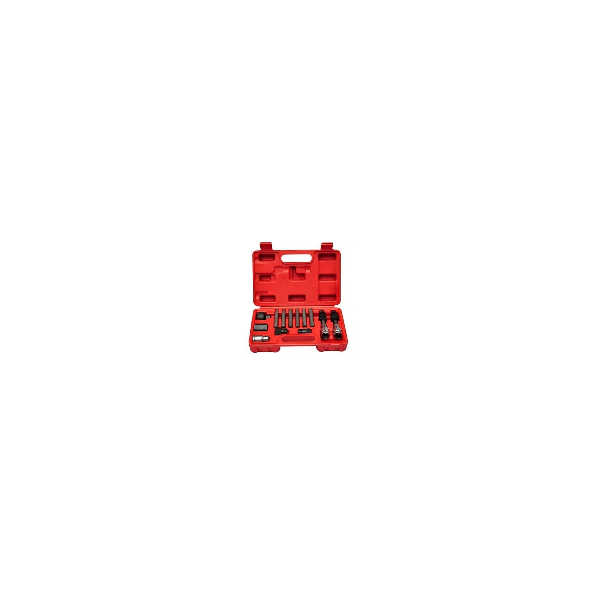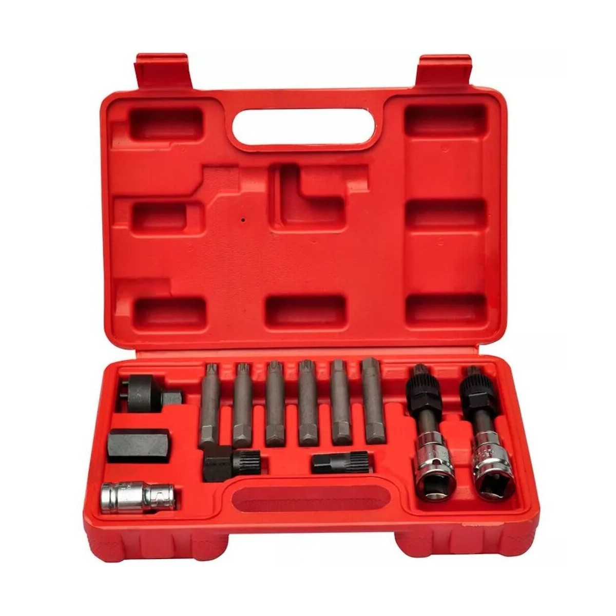 Kit pour installation de la poulie d'entraînement. Tous les accessoires nécessaires au changement des joints à rotule son présents dans le coffret. Compatible avec les alternateurs Bosch et Renault. Adaptateurs pour Volkswagen, Audi, BMW, Mercedes et Ford. Forêts hexagonaux : 8 et 10 mm Forêts cannelés M8 + M 10 Forêts T-profile : T 40 and T 50 2 forêts M 50 and M 10 pour usage 33 dents Insert special : adaptateurs Bosch et Renault Adaptateurs pour : VW, Audi, BMW, Mercedes and Ford