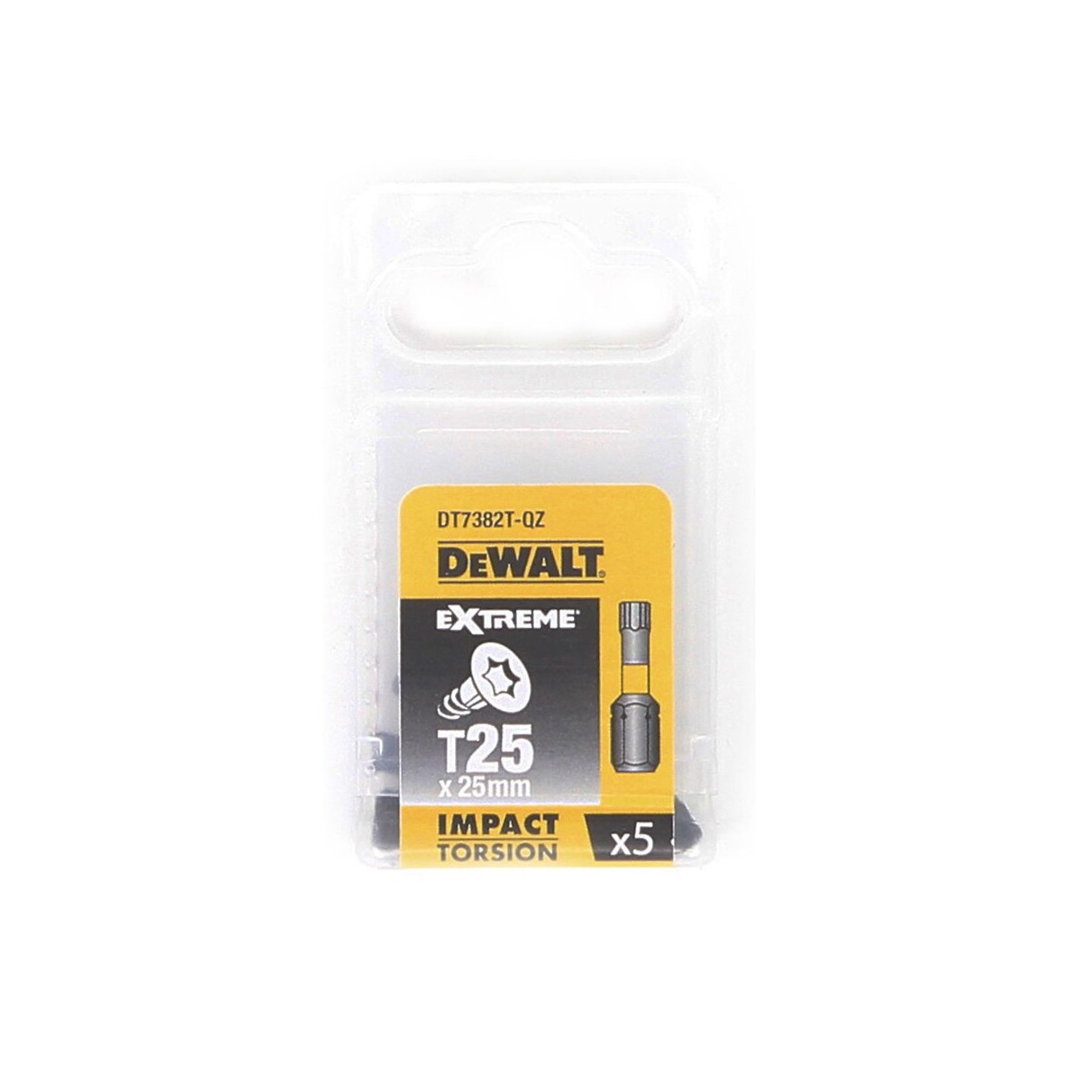 Contenu du paquet: - 5 x DeWalt DT 7382 T Embouts de visseuse Torsion Extreme Impact Imp. T25 25 mm Description du produit: Les embouts DT 7382 T de DeWalt possèdent une tête de coupe parfaitement ajustée, qui empêche tout glissement et permet ainsi une durée de vie plus longue. En raison de la forte force magnétique, il est également possible de travailler avec l'opération à une main. La flexibilité optimale du foret assure une durée de vie maximale, même à des couples élevés. Spécifications techniques: Marque: DeWalt Longueur de travail: 25 mm Contenu de l'emballage: 5 pièces