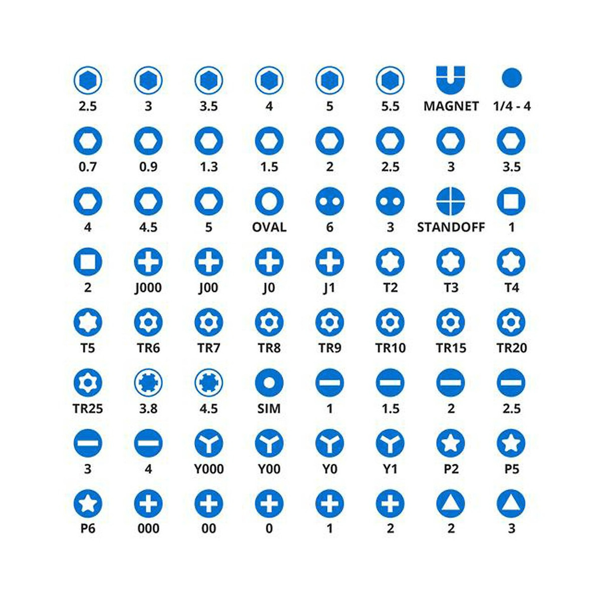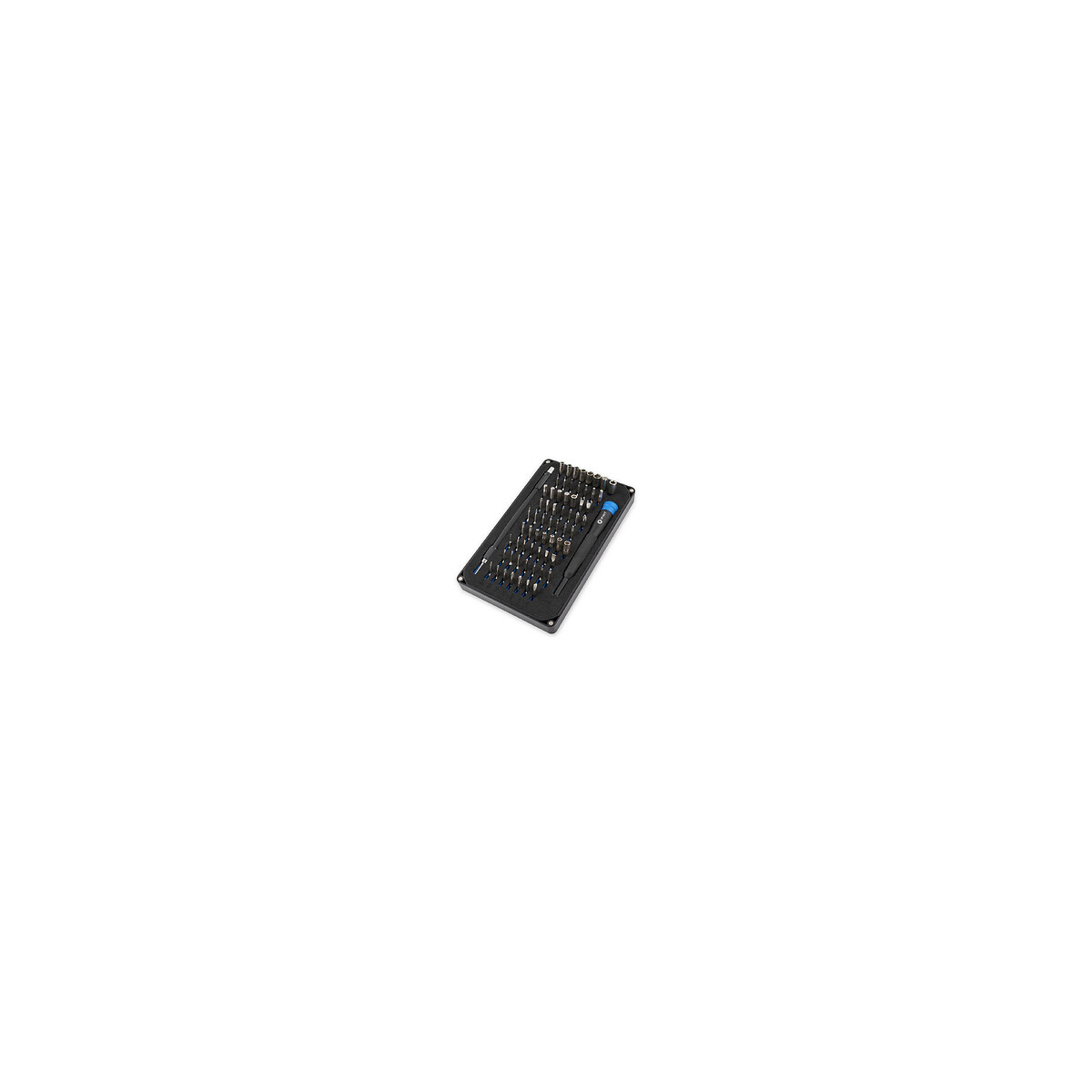 Soigneusement rangés et facilement transportables, vous recevrez 64 embouts différents de haute qualité pour toutes sortes de travaux de visserie, des appareils électroniques aux meubles. Chaque pièce est testée. Le set inclut également le manche de tournevis ergonomique spécialement conçu par iFixit. Avec cet équipement complet, vous êtes prêt pour faire face à n’importe quelle vis. - Manche de tournevis en aluminium anodisé avec porte-embout aimanté (4 mm), poignée moletée et tête pivotante à roulement à bille - Extension flexible de 150 mm - 64 embouts de précision (4 mm) dans les tailles suivantes : Cruciforme (Phillips) 000, 00, 0, 1, 2 Plat 1, 1.5, 2, 2.5, 3, 4 mm Torx T2, T3, T4, T5 Torx Security TR6, TR7, TR8, TR9, TR10, TR15, TR20, TR25 Pentalobe P2, P5, P6 JIS J000, J00, J0, J1 Hexagonal 0.7, 0.9, 1.3, 1.5, 2, 2.5, 3, 3.5, 4, 4.5, 5 mm Tri-point Y000, Y00, Y0, Y1 Tourne-écrous 2.5, 3, 3.5, 4, 5, 5.5 mm Carré 1, 2 Gamebit 3.8, 4.5 mm Spanner 6, 8 Triangulaires 2, 3 mm Embout pour vis d'entretoise iPhone Embout ovale Embout magnétique pour attraper les petits composants Embout éjecteur de carte SIM Adaptateur tournevis 1/4" à 4 mm