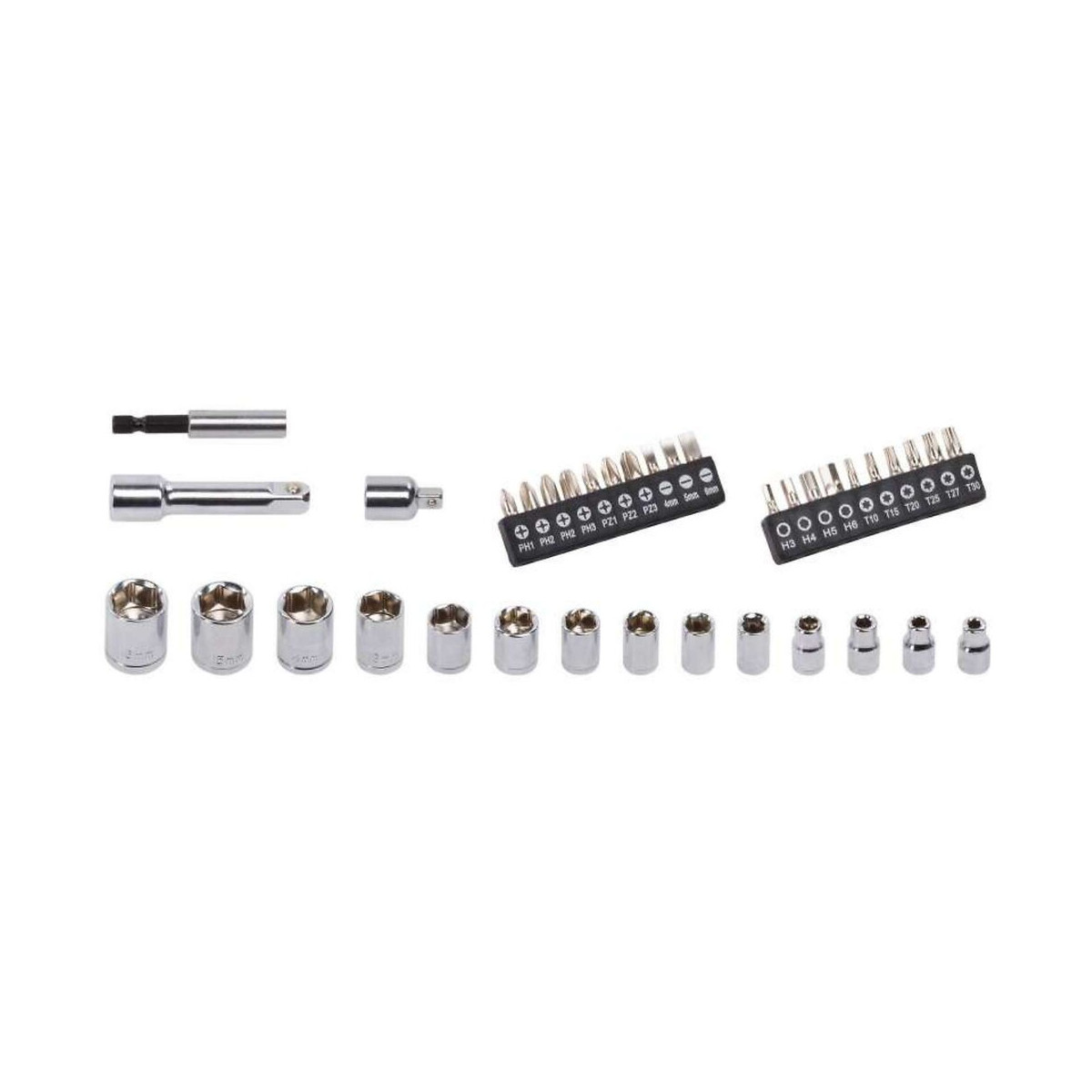 Description détaillée du produit: Produit: coffret clés à douilles Nombre de pièces incluses: 40 Poignées ergonomiques Porte-embouts magnétique Matière clés: acier chrome vanadium Finition: satinée Coloris: rouge et noir Marque: Kreator Contenu du coffret: 10x clés à douille 1/4: 4 / 4,5 / 5 / 6 / 7 / 8 / 9 / 10 / 11 / 12 mm 4x clés à douille 3/8: 13 / 14 / 15 / 16 mm 3x embouts de vissage SL: SL4 / SL5 / SL6 4x embouts de vissage PH: PH1 / 2x PH2 / PH3 3x embouts de vissage PZ: PZ1 / PZ2 / PZ3 6x embouts de vissage TX: T10 / T15 / T20 / T25 / T27 / T30 4x embouts de vissage HEX: H3 / H4 / H5 / H6 1x adaptateur 1/4 à 3/8 1x clé anglaise 1x broche 3/8: 75mm 1x tournevis à cliquet 1x cliquet court réversible stubby: 1/4 et 3/8 1x porte-embouts magnétique: 60mm