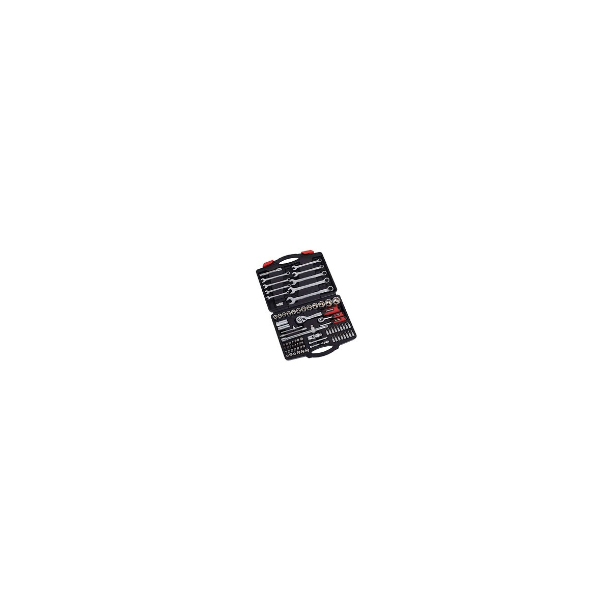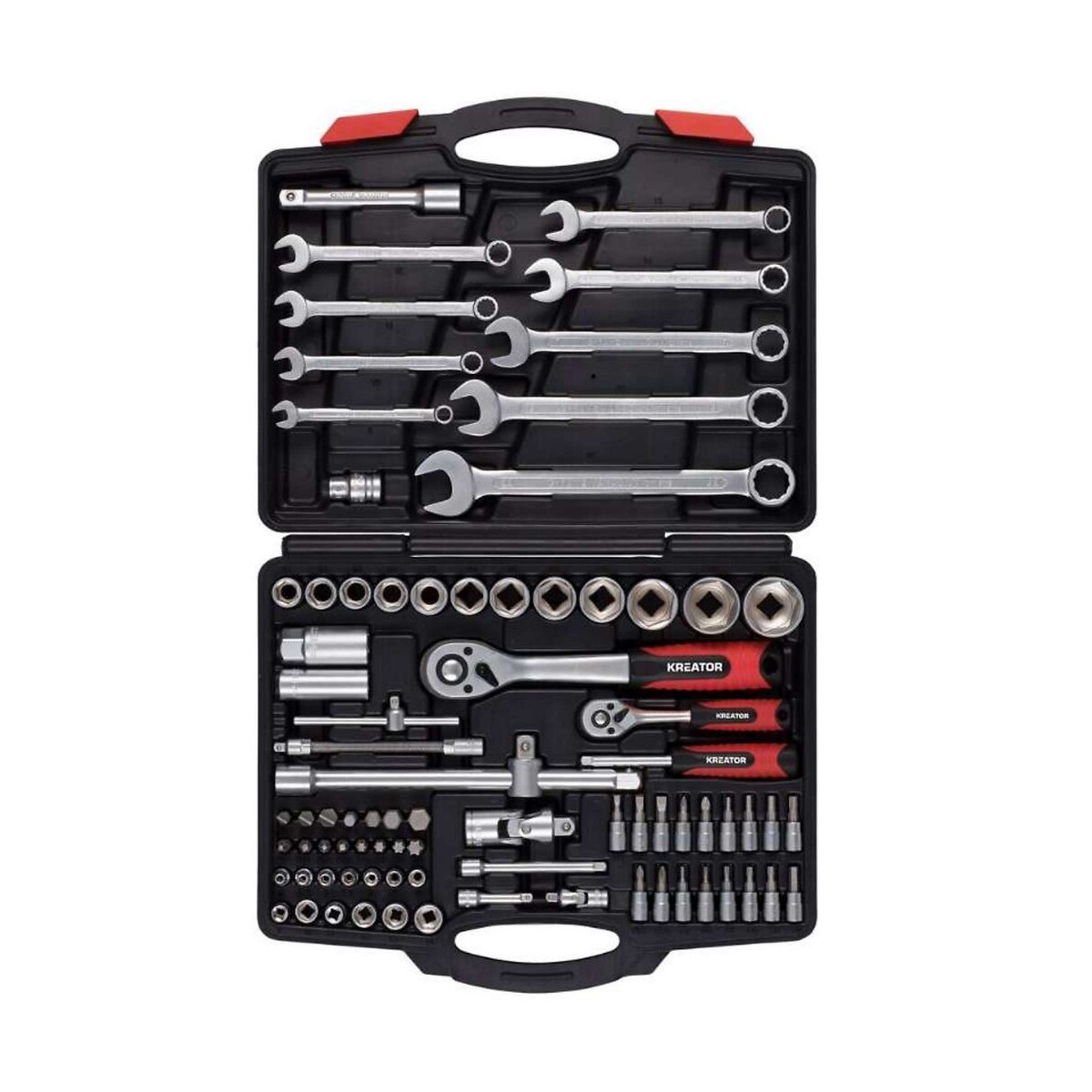 Description détaillée du produit: Produit: mallette clés à douilles Nombre de pièces incluses: 81 Pièces ergonomiques Clés durables, de qualité professionnelle Matériau: acier chrome vanadium Finition: satinée Coloris: rouge et noir Marque: Kreator Contenu du coffret: 1/2: 3x embouts de vissage SL: SL8 / SL10 / SL12 2x embouts de vissage PH: PH3 / PH4 2x embouts de vissage PZ: PZ3 / PZ4 4x embouts de vissage TX: T40 / T45 / T50 / T55 4x embouts de vissage HEX: H3 / H4 / H5 / H6 12x clés à douille: 14 / 15 / 16 / 17 / 18 / 19 / 20 / 22 / 24 / 27 / 30 / 32 mm 9x clés à cliquet: 8 / 10 / 11 / 12 / 13 / 14 / 17 / 19 / 22 mm 1x joint de cardan 2x clés à bougie 16 & 21 mm 2x broches 125 & 250 mm 1x porte-embouts 1x adaptateur à trois voies 1x cliquet 72 T 1/4: 3x embouts de vissage SL: SL4 / SL5,5 / SL7 2x embouts de vissage PH: PH1 / PH2 2x embouts de vissage PZ: PZ1 / PZ2 6x embouts de vissage TX: T8 / T10 / T15 / T20 / T25 / T30 4x embouts de vissage HEX: H3 / H4 / H5 / H6 13x clés à douille: 4 /4,5 / 5 / 5,5 / 6 / 7 / 8 / 9 / 10 / 11 / 12 / 13 / 14 mm 1x joint de cardan 1x manche coulissant en T 2x broches 50 & 100 mm 1x broche flexible 1x tournevis 1x cliquet 72 T