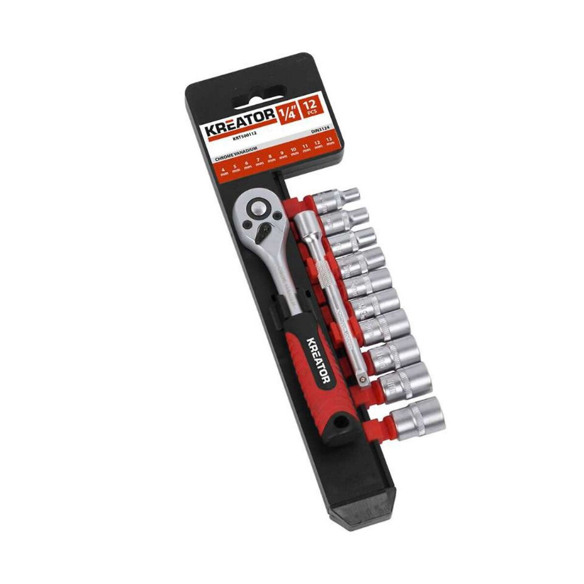 Description détaillée du produit Produit: Coffret cliquet 1/4 avec douilles 10 douilles de dimensions: 4-5-6-7-8-9-10-11-12-13mm Carré d'entraînement: 1/4 =6,35mm Rallonge longueur: 150mm Conditionnement: 12 pièces Matériau: acier au Chrome-Vanadium Douille: finition chromée satinée Marque: Kreator