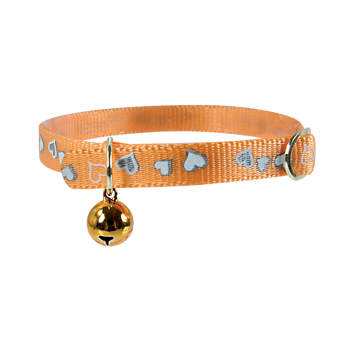 Des coeurs en couleur ! Ce collier en nylon résistant sera confortable à porter pour votre chat. Particularité : les coeurs réfléchissants vous permettront de repérer votre chat la nuit. Agrémenté d'un grelot assorti permettant de donner du mouvement et guetter votre chat. Sécurité : muni d'un élastique pour éviter un éventuel étranglement. S'ajuste parfaitement au cou de votre chat. Facile à entretenir grâce à un simple coup d'éponge. Coloris : orange. Dimension : Taille : 30 cm.