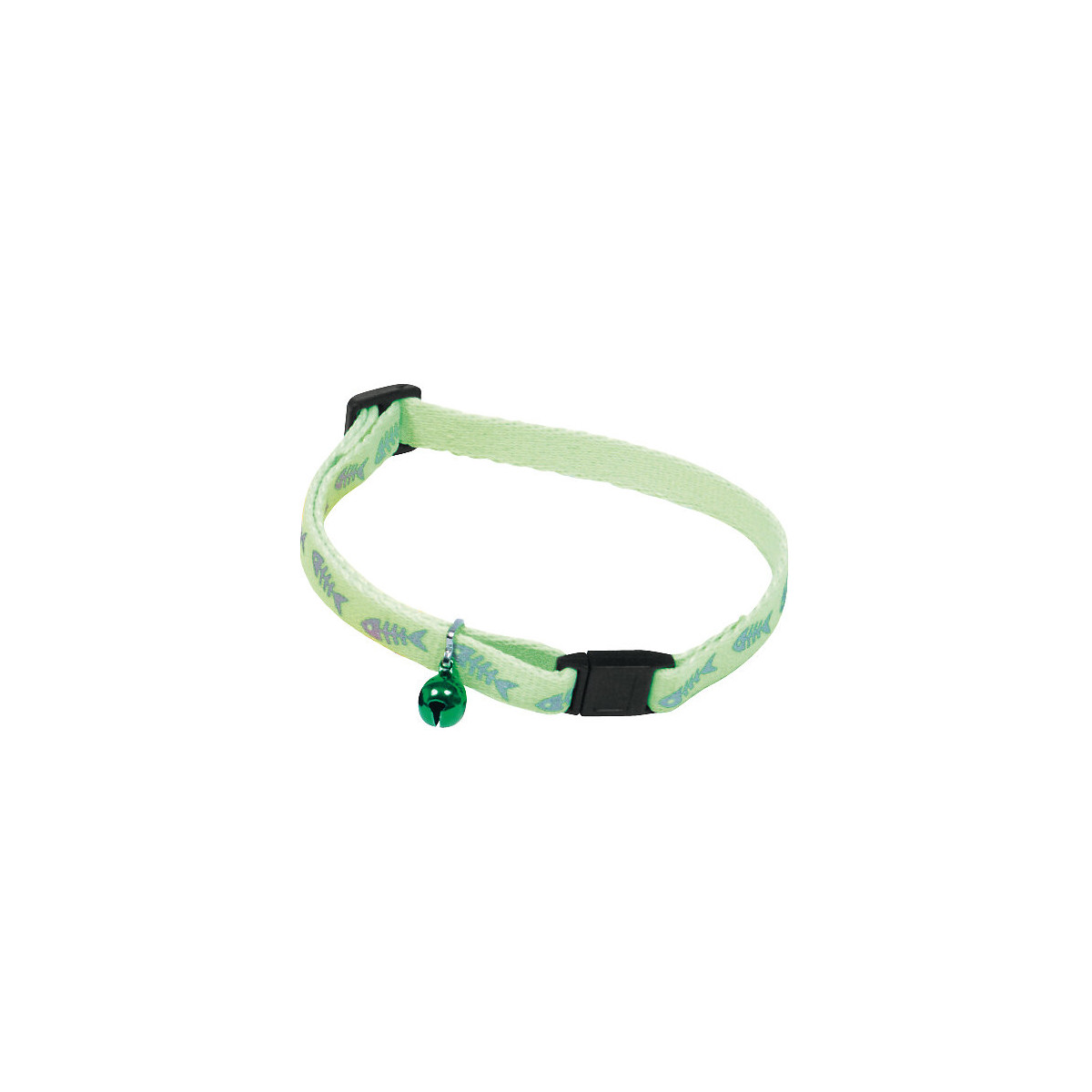 Collier réglable Fluo fish pour chat en nylon. Coloris : vert avec motifs poissons réfléchissants. Boucle de sécurité anti-étranglement. Fourni avec 1 grelot. Dimensions : Largeur 10 mm x Longueur 25 à 35 cm.