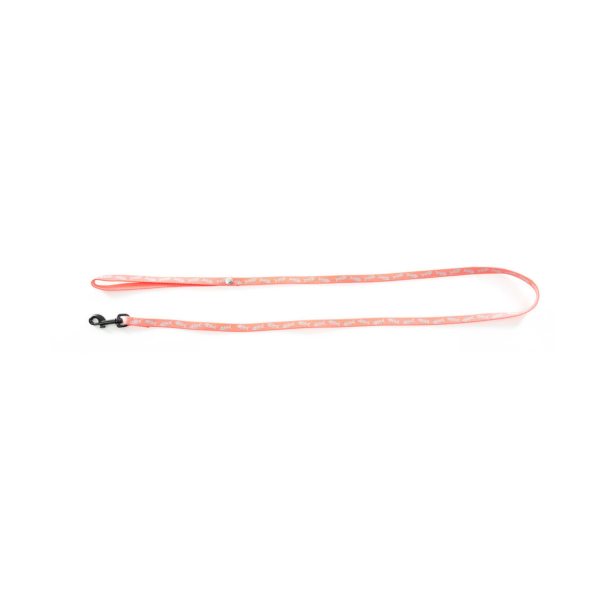 Laisse Fluo fish pour chat en nylon. Coloris : rose avec motifs poissons réfléchissants. Mousqueton laqué noir. Dimensions : Largeur 10 mm x Longueur 120 cm.