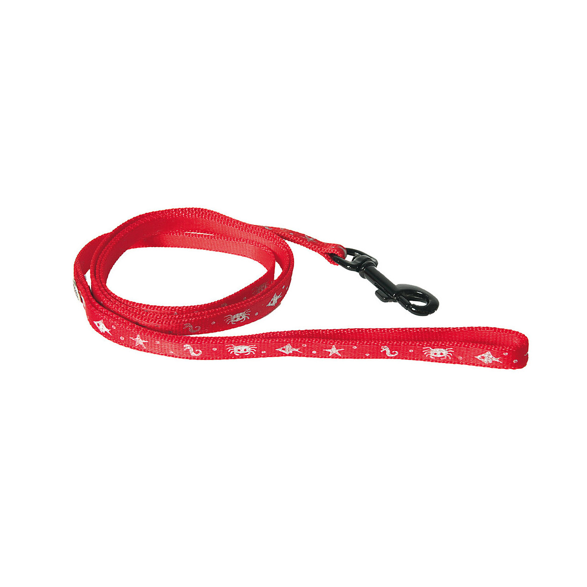 Laisse Océan pour chat en nylon. Coloris : rouge avec motifs argentés. Mousqueton carabine laqué. Dimensions : Largeur 10 mm x Longueur 100 cm.