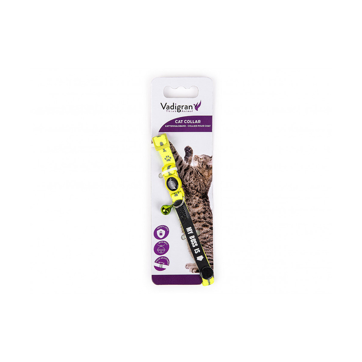 Collier chat MY BOSS IS. Poisson jaune. 20-30cm x 10mm. Description. Pour les chat, Réglable en continu de 20 a 30 cm. Avec clochette. et emplacement pour écrire le nom ou téléphone du propriétaire. Avec fermeture de sécurité qui s'ouvre lorsque le chat reste coincé. En nylon. Collier chat MY BOSS IS. Poisson jaune. 20-30cm x 10mm. Description Pour les chat, Réglable en continu de 20 a 30 cm. Avec clochette. Avec fermeture de sécurité qui s'ouvre lorsque le chat reste coincé. En nylon. avec emplacement pour noter les information du propriétaire. Photo non contractuelle, car il y a plusieurs vendeurs sur une même fiche produit.Spécifications techniques
