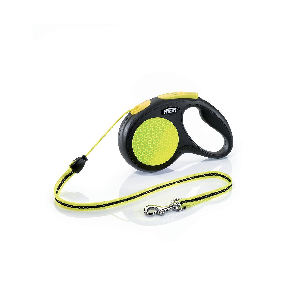 Laisse Flexi néon pour chien en plastique avec sangle à mordre. Coloris : motifs imprimés en couleur néon. Boîtier résistant. Mousqueton chromé. Dimension : Largeur 180 mm. Longueur : taille M.