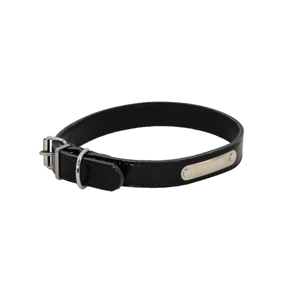 Collier Riveté pour chien en cuir. Coloris : noir. Plaque métal d'identification rivetée. Dimensions : Largeur 22 mm x Longueur 55 cm.