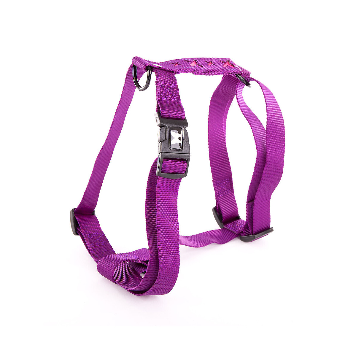 Harnais Croix violette pour chien en nylon. Coloris : croix violette. Motifs découpés dans la sur-épaisseur. Accessoires laqués noirs. Bouclerie rapide et en plastique. Dimensions : Largeur 16 mm x Longueur 30/50 cm.