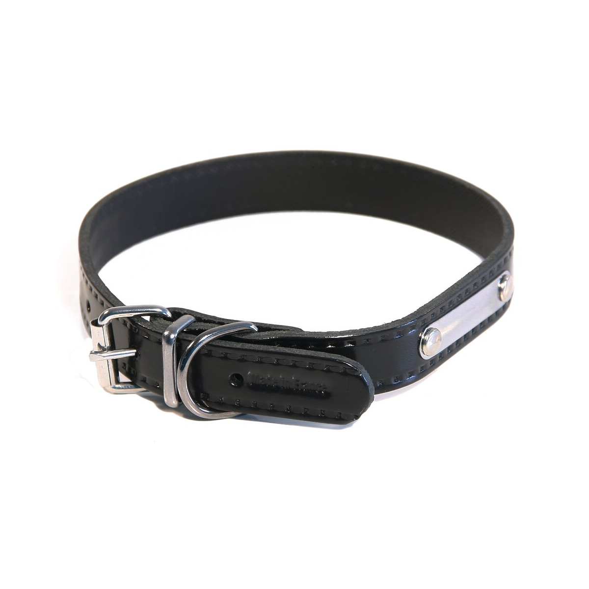 Collier Riveté pour chien en cuir. Coloris : noir. Plaque métal d'identification rivetée. Dimensions : Largeur 20 mm x Longueur 50 cm.