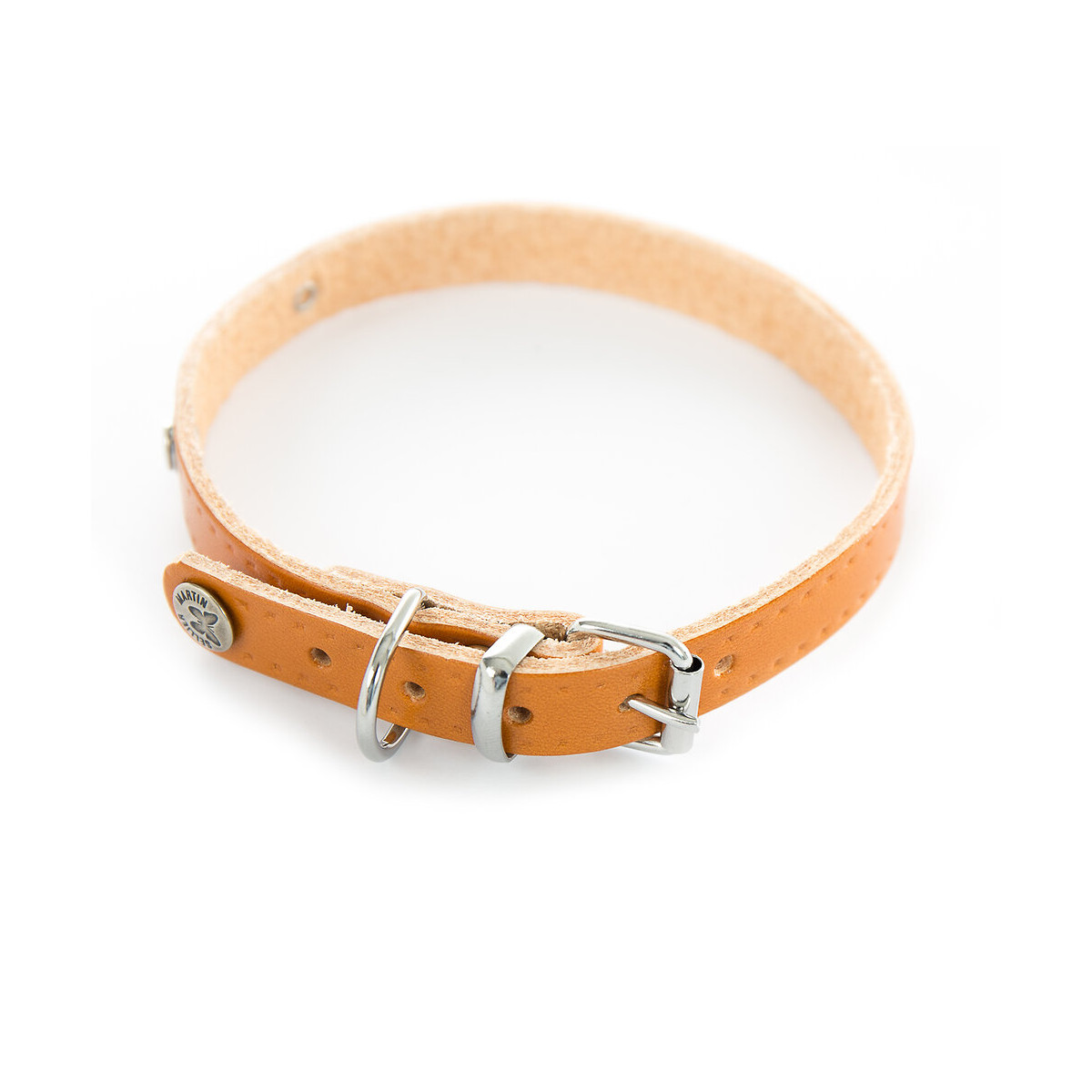 Collier Riveté pour chien en cuir. Coloris : naturel. Plaque métal d'identification rivetée. Dimensions : Largeur 18mm x Longueur 45cm.
