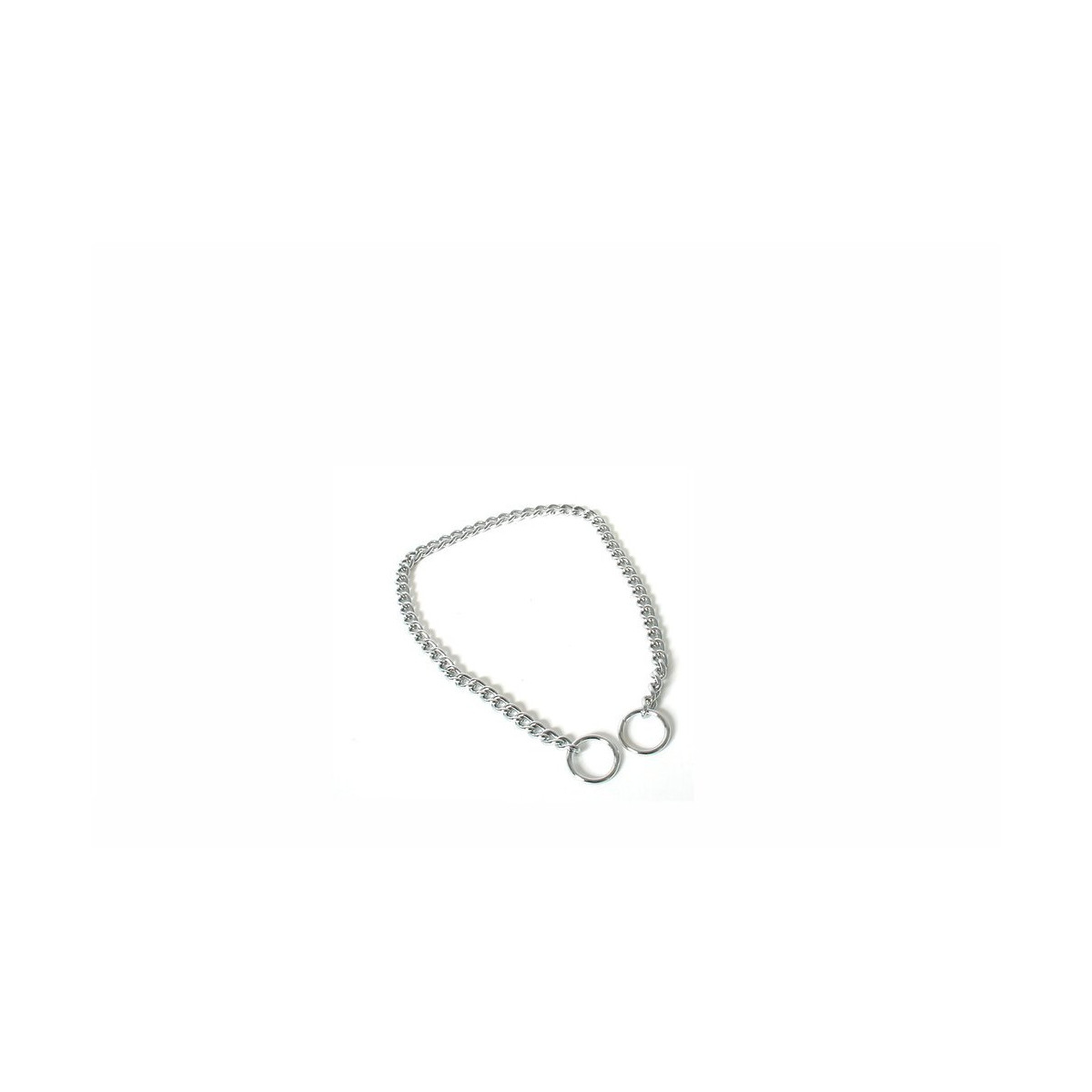 Collier pour chien simple en métal chromé. 1 rang. Longueur mesurée du milieu des anneaux. Dimensions : Largeur 45 mm x Longueur 60 cm.