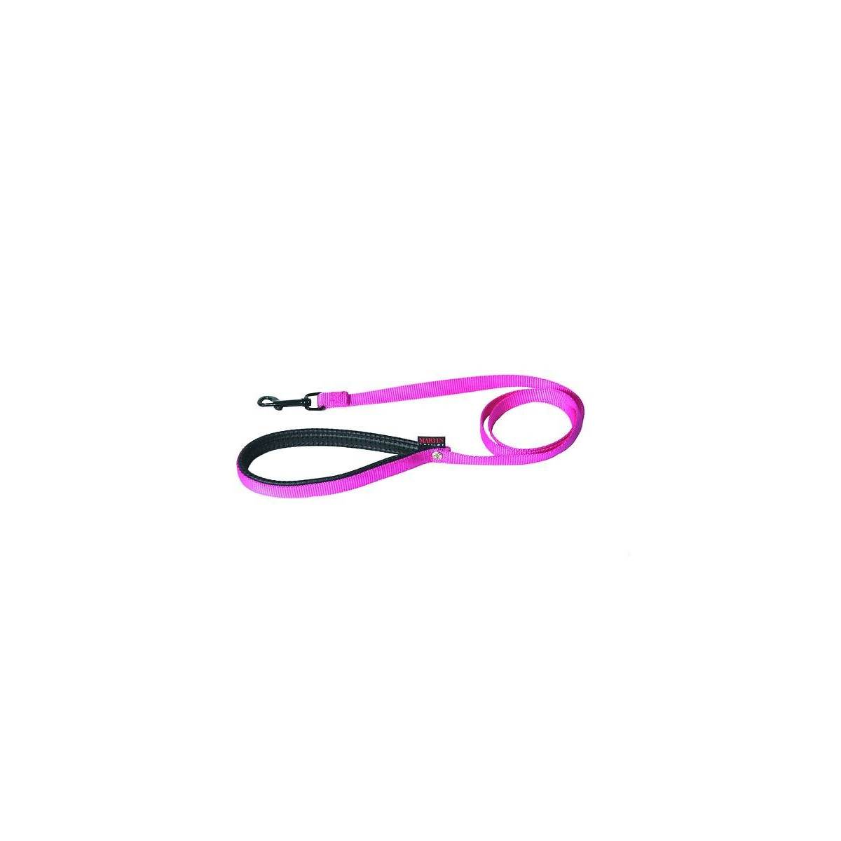 Laisse pour chien en nylon. Coloris : rose. Avec mousqueton carabine et poignée confort. Dimensions : Largeur 16 mm x Longueur 120 cm.
